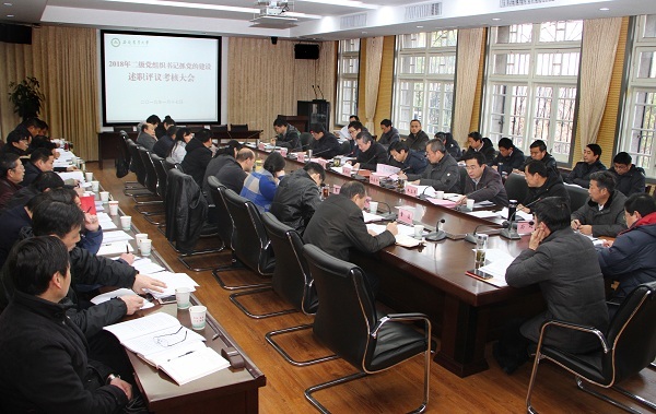 本网讯 1月17日,学校2018年度二级党组织书记抓党的建设述职评议考核会在第三会议室召开。校领导江春、裴树东、姚佐文、蒋家平、韩军出席了会议,校党委委员、党群部门主要负责人、各二级党组织书记、院长,党支部书记代表等50余人参加了会议。会议由校党委书记江春主持。