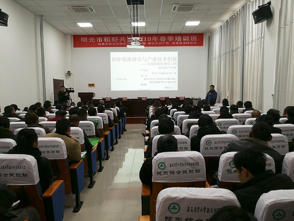 本网讯2月15日,明光市稻虾共育技术2019年春季培训班在我校皖东综合试验站顺利开班。此次培训班由皖东综合试验站联合明光市农委、明光市水产局、明光市龙虾产业协会、安农大·明光市水产产业联盟共同举办,来自明光市112名稻虾共育种养殖户参加了培训。培训班上,滁州市水产技术推广站站长凌武海讲授了《稻虾共育精准作业》技术,我校副教授讲授了《稻虾养殖失败与病害分析》课程;水产产业联盟首席专家连同两位授课专家进行了现场答疑。