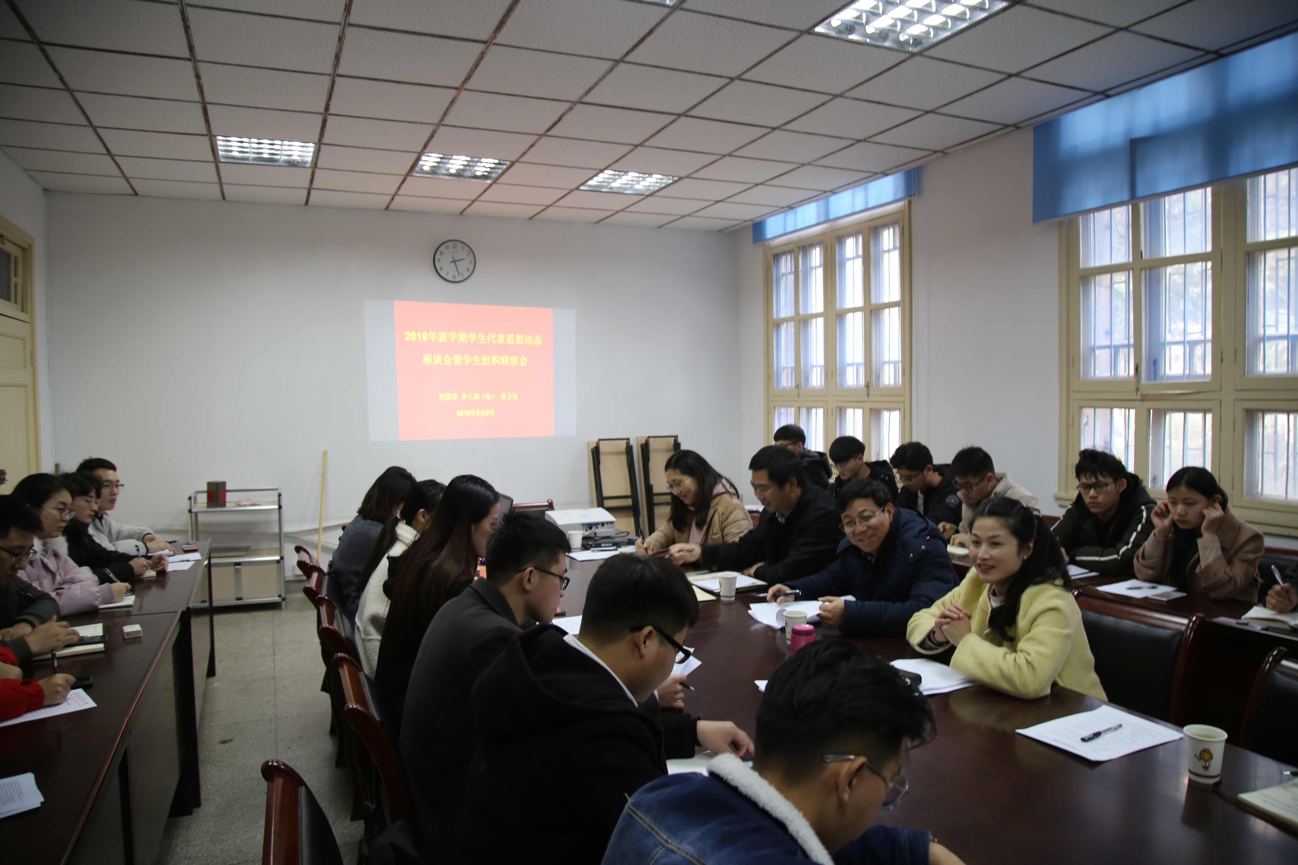 本网讯 3月6日下午,校团委、学工部(处)、保卫处在勤政楼134会议室召开新学期学生代表思想动态座谈会暨学生组织联席会,来自16个学院的32名学生代表参加了座谈会。校纪委书记裴树东,保卫处处长涂德润、学工部(处)负责人出席会议。会议由校团委副书记任琪主持。