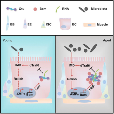 该研究围绕衰老和寿命如何调控这一人们十分关注的问题,以果蝇为模型,揭示了蛋白聚集调控衰老与长寿新机制。计山明教授及其合作者发现RNA结合蛋白Otu在生理和体外状态下能发生聚集和液-液相变过程,且其LC(Low complexity)结构域在蛋白聚集和液-液相变过程中发挥着不可或缺的作用;LC结构域的存在促进了Otu蛋白的去泛素酶的活性,进而调控肠道的免疫活性;机制研究表明,Otu/Bam/dTraf6三者在肠道细胞中能形成“负反馈调节轴”,动态调控肠道IMD免疫信号,从而维持肠道屏障及其稳态,最终调控个体的寿命。蛋白在细胞中的状态直接影响细胞的命运决定及疾病的发生。已有研究表明,蛋白的异常聚集是阿尔茨海默症、亨廷顿舞蹈症、肌萎缩侧索硬化症等许多神经退行性疾病的主要病因。该研究的开展从另一个层面揭示蛋白聚集/相变的正向生物学功能,对人们更好地理解蛋白聚集如何调节其自身酶活及个体生理过程有重要意义。