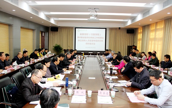 本网讯3月20日下午,省委党校第6期加强高校思想政治工作和事业单位领导人员管理专题研讨班的43位领导干部来我校开展以“遵循教书育人规律探索实践育人途径”为主题的调研活动。省委党校教育长胡忠明参加调研。校领导江春、程备久、马传喜、蒋家平陪同调研。校党委书记江春主持座谈会。