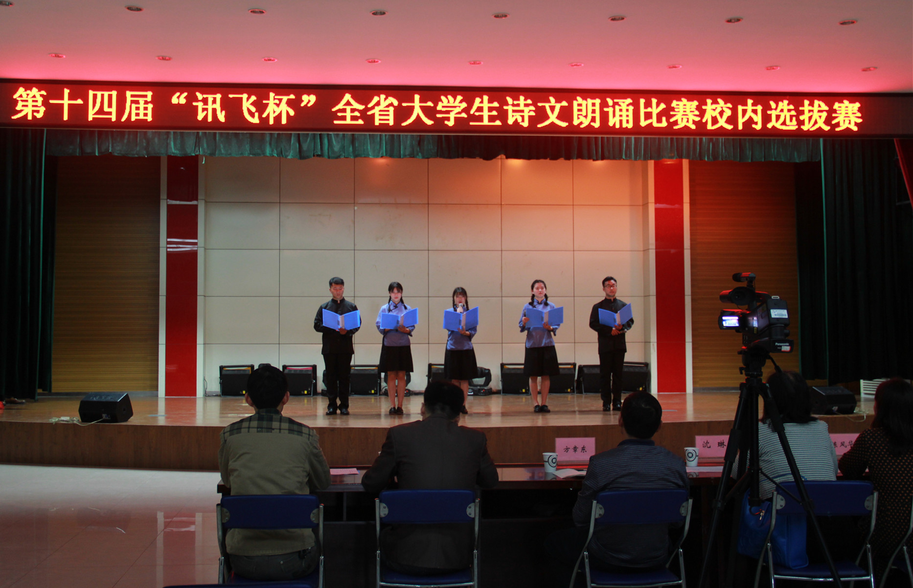 本网讯为弘扬中华民族优秀传统文化,提高新时代大学生人文素养,庆祝新中国成立70周年,4月22日下午,第十四届“讯飞杯”全省大学生诗文朗诵比赛校园选拔赛在我校大学生活动中心成功举办。经过前期各学院初赛作品筛选,来自全校不同专业的12支队伍脱颖而出,成功入围本次大赛决赛。本次决赛主评委由人文社科学院专业教师担任,人文社科学院院长方章东、校教务处负责人担任嘉宾评委。