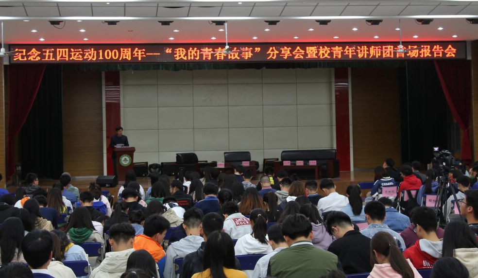 本网讯 4月26日晚,我校在欣苑四楼学生活动中心举行“我的青春故事”分享会暨校青年讲师团首场报告会。校党委常委、纪委书记裴树东,宣传部、学工部(处)、校团委等单位相关负责人,各学院团委负责老师,校青马班学员以及学院学生代表400余人参加了活动。