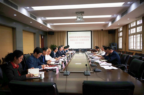 本网讯 5月9日下午,省政协农业和农村委员会主任陈鹏、专职副主任朱云一行6人来校调研。校领导江春、夏涛、裴树东,省政协农业和农村委员会副主任、原校长程备久出席座谈会。