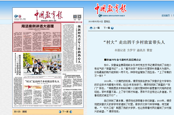 本网讯 今天出版的《中国教育报》头版,以“‘村大’走出四千乡村致富带头人”为题,报道了我校“村大工程”先进事迹。文章以“村大工程”为主题,系统阐述了我校致力于打造乡村人才队伍,培养新型职业农民,举全校之力服务脱贫攻坚的具体举措。