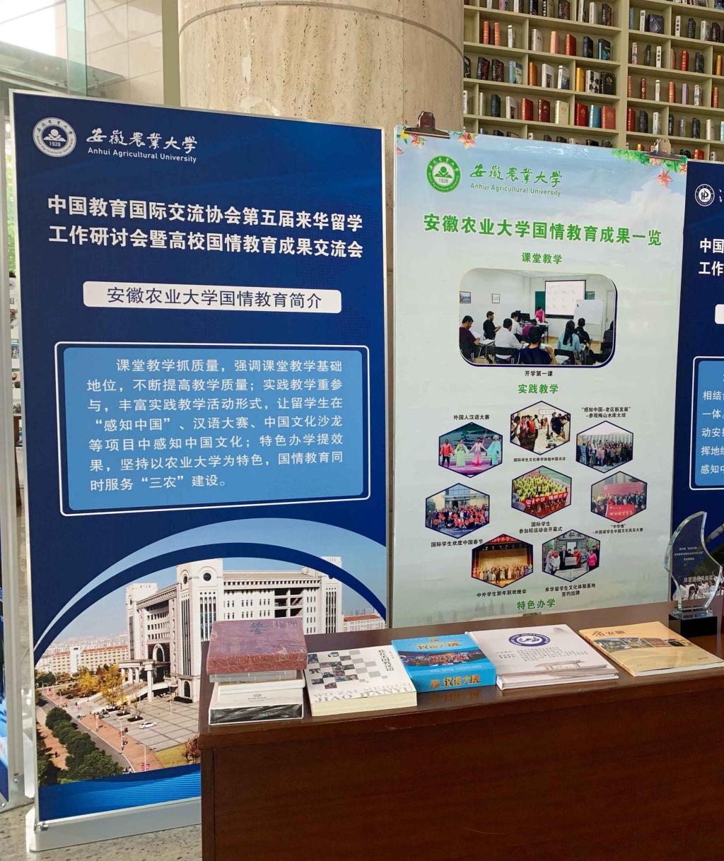 本网讯6月13日,教育部委托中国教育国际交流协会在浙江理工大学召开第五届来华留学工作研讨会暨高校国情教育成果交流会。中国教育国际交流协会秘书长赵灵山、教育部国际合作与交流司留学工作处处长安延、来自全国200多个教育行政部门和高校的360余名代表参加了相关活动,42所高校受邀集中进行了国情教育优秀成果展示。我校此次受邀参加了国情教育成果展。作为安徽省唯一一所受邀参展的高校,我校在现场和来自全国的来华留学工作同仁们分享了成果、交流了经验。参展期间,国际教育学院相关老师向来宾介绍了我校来华留学国情课堂教学、实践教学,特色办学等国情教育相关成果。我校参展内容包括学校国情教育开展的课程建设情况,各类活动的照片及影视资料、获奖奖杯等。