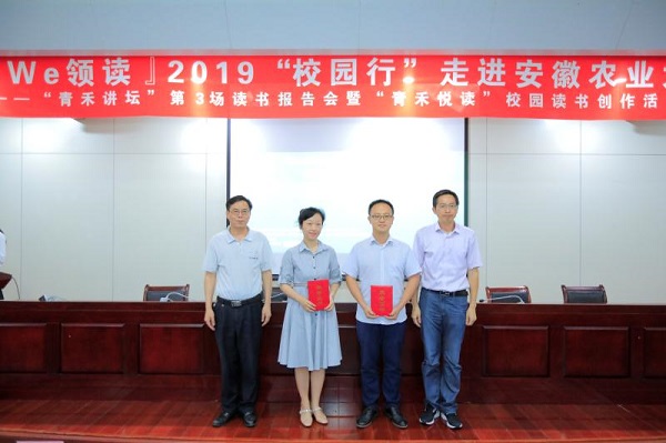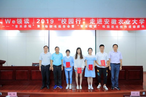 本网讯6月18日晚,由校图书馆、校团委、人文社会科学学院主办,图书馆新媒体团队、图书馆学生服务中心团队、图书馆微传媒团队、青禾悦读推广团队协办,WE领读承办的『We领读』2019“校园行”走进安徽农业大学——“青禾讲坛”第3场读书报告会暨“青禾悦读”校园读书创作活动颁奖仪式在校图书馆第2学术报告厅圆满举行。『We领读』总策划赵媚,『We领读』领读者、中国科技大学管理学院院长助理赵征博士,『We领读』学术顾问、中国科技大学出版社副编审杨振宁,『We领读』领读者、新华网安徽频道总经理助理鲁金茗,我校相关单位负责人等出席本次活动。校图书馆馆长吴文革为本次活动致辞。