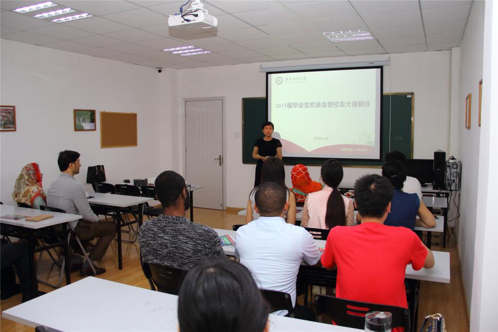 会上,姜红代表学院给“校友大使”颁发了聘书。学院教师代表向毕业生们赠送了礼物。汉语老师代表、毕业班班主任也分别向毕业生表达了诚挚的祝贺和美好的祝愿。会后,全体师生在国际学生综合楼前合影留念。