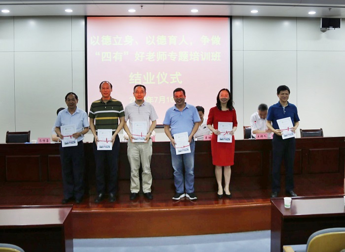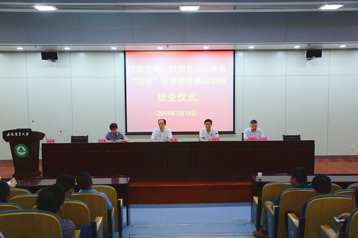 本网讯7月10日下午,我校“以德立身、以德育人,争做‘四有’好老师”专题培训班在校图书馆第二报告厅举行结业仪式。校长夏涛、校党委副书记裴树东、副校长马传喜、校纪委书记陈文兵出席结业仪式,相关职能部门负责人、各学院党委书记、系部主任、副主任参加会议。会议由陈文兵主持。