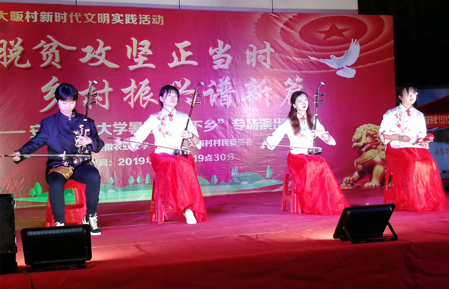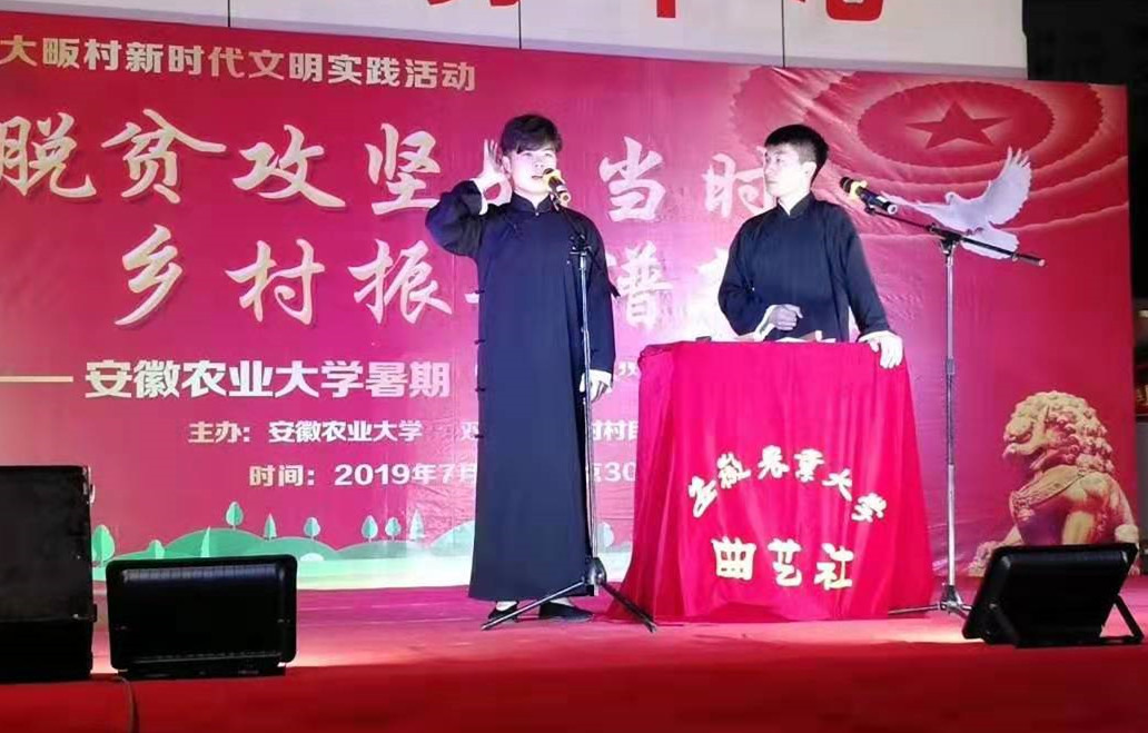 本网讯7月10日晚,我校学子走进定点帮扶贫困村金寨县大畈村,开展以“脱贫攻坚正当时 乡村振兴谱新篇”为主题的暑期“三下乡”专场文艺演出活动。校团委、轻纺工程与艺术学院、我校驻大畈村扶贫工作队全体成员,金寨县、双河镇相关部门领导及大畈村村民400余人共同观看演出。金寨在线全程直播本场晚会,吸引了4.98万余人在线观看。