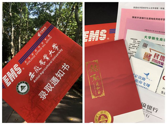 我校2019级本科新生各批次高考录取通知书正陆续发放,为确保录取通知书快速及时、准确无误地送达考生手中,我校通过中国邮政EMS特快专递寄发全部录取通知书,并在信封上特别标注“安徽农业大学录取通知书”字样。