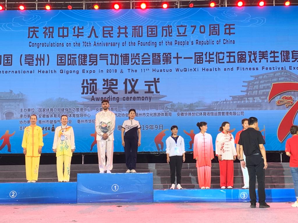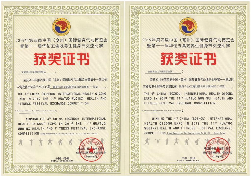 本网讯 9月11日上午,2019年“第四届中国(亳州)国际健身气功博览会暨第十一届华佗五禽戏养生健身节交流比赛”在亳州开幕。我校国际教育学院组织来自六个国家的国际学生参加了比赛。前期,我校国际生代表队在校体育部老师的指导下,精心准备,认真训练,在暑期一个多月的训练中,学习了四套中国传统气功的基本套路。比赛中,同学们奋发进取,努力拼搏,获得了团体赛易筋经项目一等奖、五禽戏项目二等奖;个人赛五禽戏、易筋经、六字诀、八段锦的多个奖项。