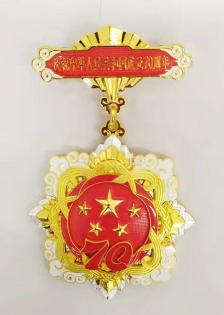 颁发“庆祝中华人民共和国成立70周年”纪念章是新中国成立70周年系列庆祝活动的重要组成部分,对于加强爱国主义教育,培育和践行社会主义核心价值观,增强中国特色社会主义伟大事业凝聚力和感召力,具有十分重要的意义。纪念章使用铜胎镀金材质,主要元素为五星、“70”飘带、团锦结、如意祥云和光芒,主色调为红色和金色。
