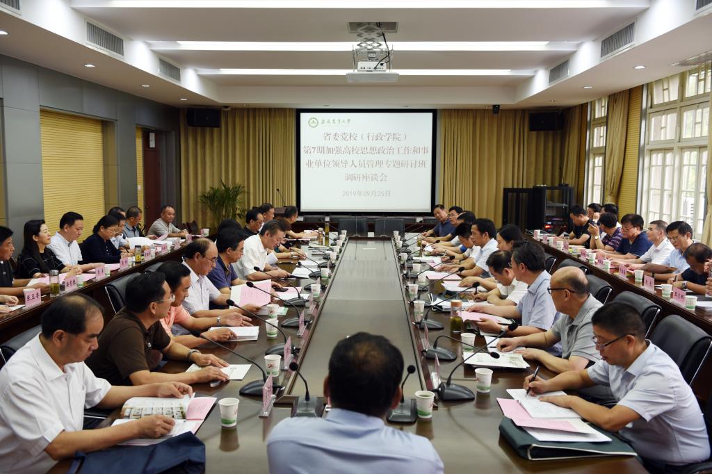 本网讯9月25日,省委党校第7期加强高校思想政治工作和事业单位领导人员管理专题研讨班的43位领导干部来我校开展以“坚持立德树人 注重实践育人”为主题的调研活动。省委党校副教育长王敬志参加调研。校党委书记江春主持调研座谈会。校领导马传喜、陈文兵、朱立军陪同调研。