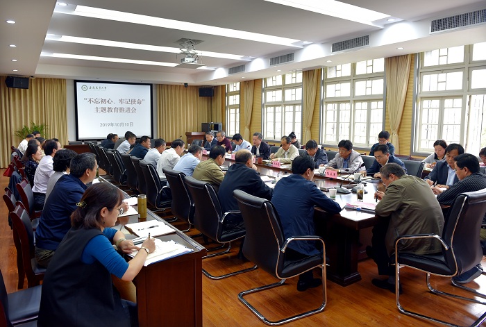 本网讯为深入落实省委主题教育工作领导小组关于第二批主题教育工作的要求,10月10日上午,校党委在第三会议室召开“不忘初心、牢记使命”主题教育推进会。校党委书记江春主持会议并讲话,校领导夏涛、裴树东、马传喜、蒋家平、韩军、陈文兵、朱立军出席会议,各二级党组织书记、督导组全体人员参加会议。