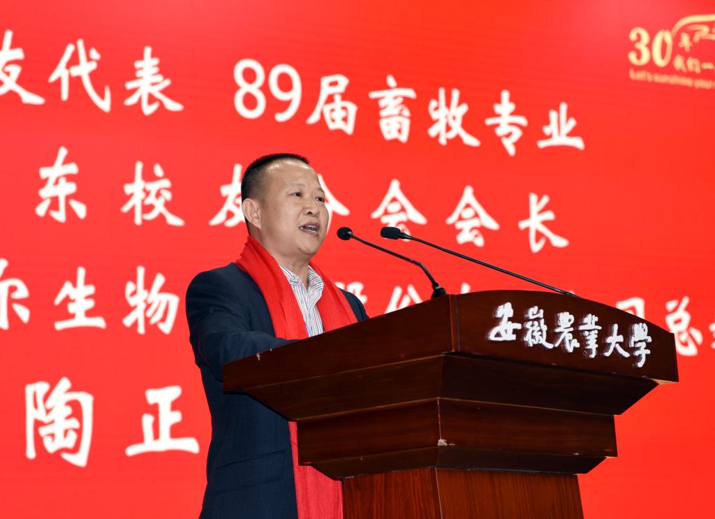 校友代表89届畜牧专业、广东校友分会会长、广州立达尔生物科技股份有限公司总裁陶正国发言,对母校的培养表示感谢,对学校发展取得的成绩表示祝贺,表示广大校友将一如既往地关注母校,继续秉承校训精神,不忘初心,勤奋学习,扎实工作,锐意进取,为祖国的建设添彩,以优异的成绩为母校争光。