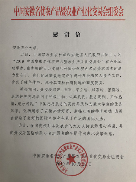 本网讯近日,中国安徽名优农产品暨农业产业化交易会在合肥举办,应组委会要求,我校外国语学院派出六名学生志愿者服务大会,为参展的各国外商、驻华使节提供陪同翻译、商务洽谈等志愿服务。组委会专门给我校外国语学院发来一封《感谢信》,对学生志愿者参与2019年中国安徽名优农产品暨农业产业化交易会服务表示感谢。