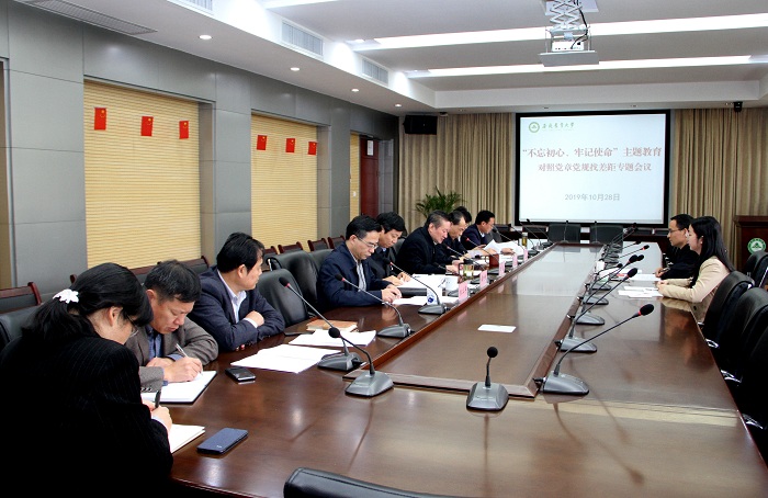 本网讯 10月28日上午,根据中央和省委主题教育检视问题工作要求,校领导班子召开对照党章党规找差距专题会议,校党委书记江春主持会议,校长夏涛列席会议。省委第十一巡回指导组孙发圣、晏江楠到会指导。