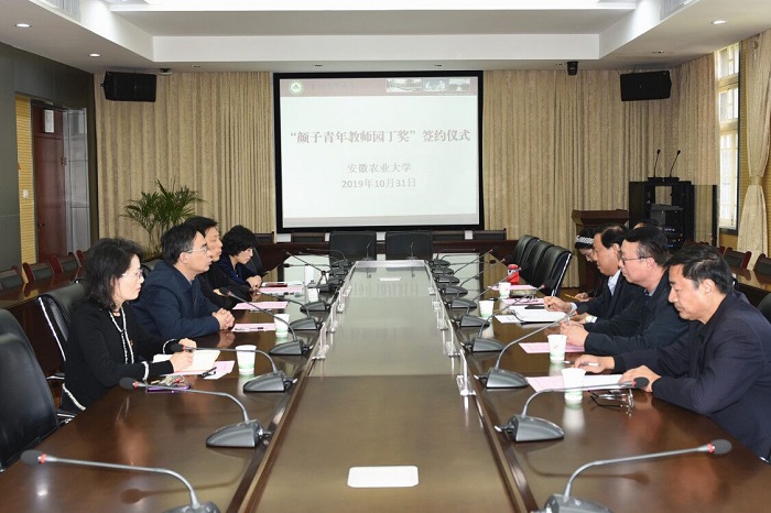 本网讯10月31日上午,我校“颜子青年教师园丁奖”签约仪式在校第三会议室举行,校党委常委、副校长朱立军、相关职能部门负责人以及安徽省现代农业发展中心主任颜继贵一行五人出席了签约仪式。会议由党委教师工作部副部长王琼主持。