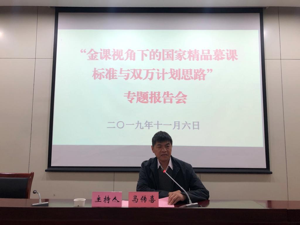 本网讯11月6日上午,学校在图书馆第二报告厅召开“金课视角下的国家精品慕课标准与双万计划思路”专题报告会。会议邀请了学堂在线课程总监、教育部在线教育研究中心部门主管李腾麟博士作《一流课程“双万计划”视角下的国家精品慕课与混合式金课建设》的专题报告,副校长马传喜主持会议,教务处负责人、各学院院长、分管教学副院长、系主任、教研室主任、实验中心主任、教学秘书参加了会议。
