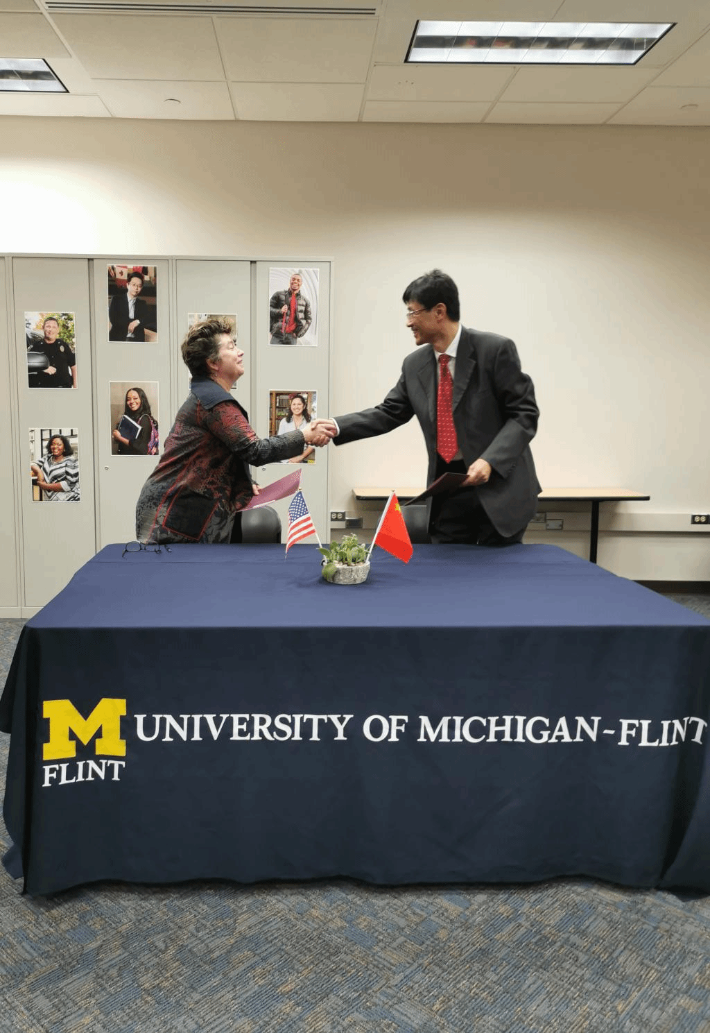 访问密西根大学弗林特分校期间,代表团参观考察了该校管理学院和文理学院的教学情况及实验室,并就开展中外合作办学项目的可行性与对方进行了深入交流。韩军介绍了我校历史沿革、办学特色和国际交流开展情况,表达了与美国密西根大学弗林特分校开展合作的积极意愿。代表团就两校金融学、机械设计制造及自动化专业以及生物技术专业的合作办学与对方院校进行了深入探讨。11月12日,韩军与密西根大学弗林特分校教务长苏珊·阿尔柯克签署两校合作备忘录,为两校开展具体合作奠定了基础。