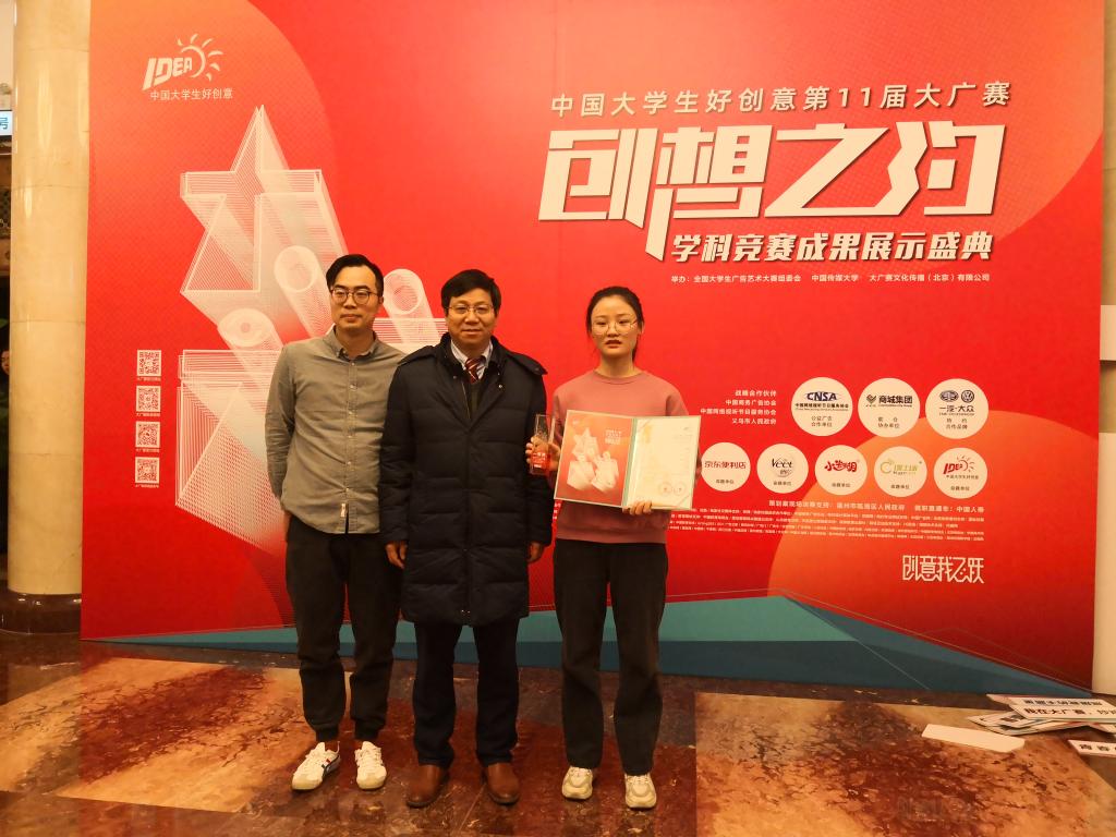 本网讯 11月23日,第十一届全国大学生广告艺术大赛颁奖典礼在全国政协礼堂召开,我校党委副书记裴树东、轻纺工程与艺术学院院长杜兆芳、获奖学生代表张双艳及指导老师参加了此次颁奖典礼。全国大学生广告艺术大赛属国家A类赛事,我校轻纺工程与艺术学院2017级视觉传达设计专业学生张双艳、许二薇的平面类广告作品《爱华仕奇幻系列》获得本届大广赛全国一等奖的优异成绩。除以之外,还有二件策划类广告作品获得全国优秀奖。此次获奖填补了我校艺术设计国家A类赛事最高奖的空白,这也是安徽省艺术设计类在全国大广赛中取得的最好成绩,极大提升了学校在全国的知名度,获得了社会各界的一致肯定。