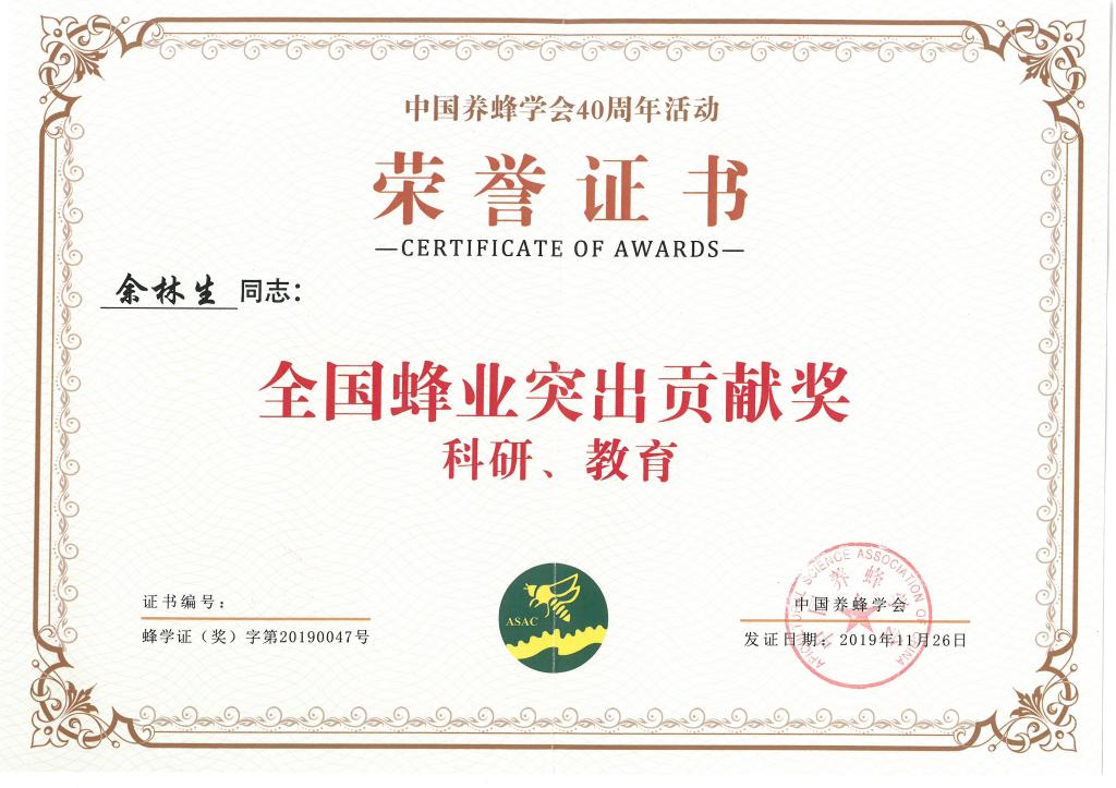 本网讯11月26日,由中国养蜂学会主办、先正达承办的"中国养蜂学会40周年"庆典活动在北京举行。来自国内外嘉宾、专家、学者及养蜂者代表约500人出席了盛会。大会表彰奖励了全国蜂业终身成就奖9名、全国蜂业特殊荣誉奖1名、国际蜂业友谊奖6名、海峡两岸蜂业发展突出贡献奖4名、全国蜂业突出贡献奖16名。中国养蜂学会副理事长、国家蜂产业技术体系岗位科学家、我校教授余林生获全国蜂业突出贡献奖。
