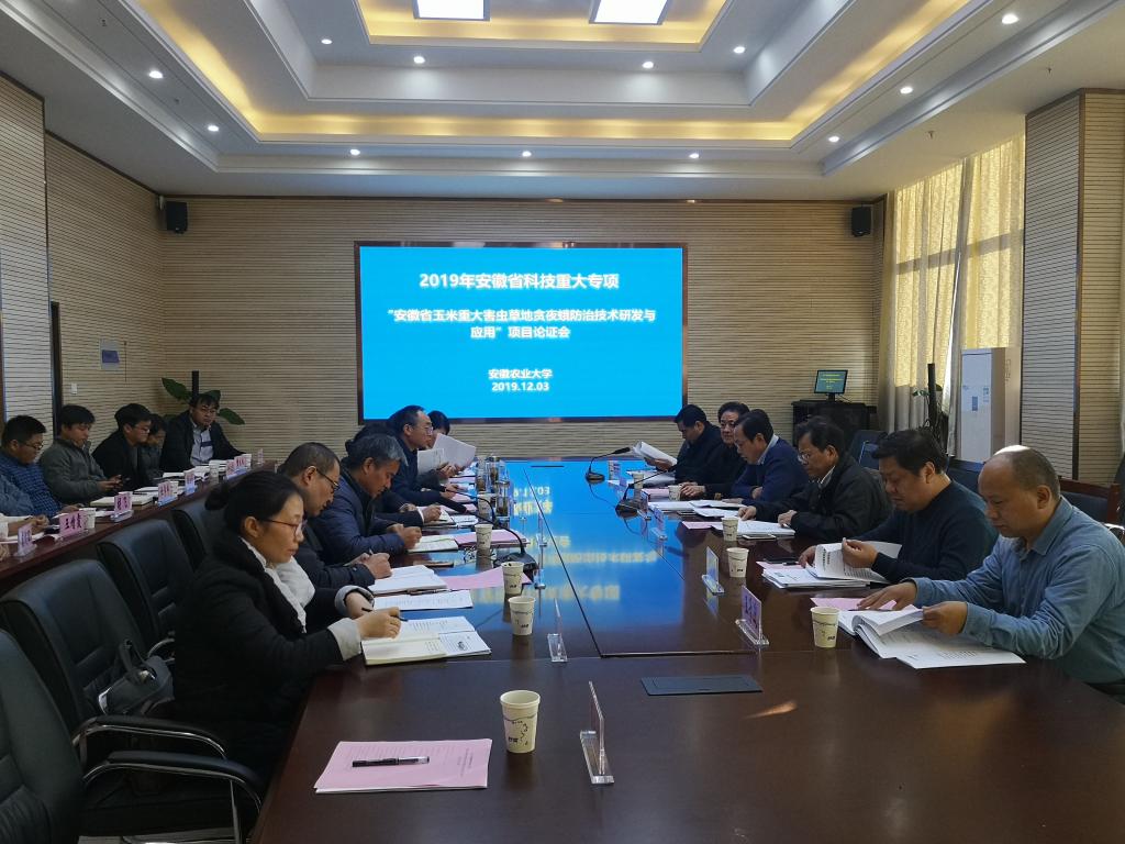 本网讯 12月3日下午,2019年安徽省科技重大专项“安徽省玉米重大害虫草地贪夜蛾防治技术研发与应用”项目论证会在我校植物保护学院圆满召开。会议邀请了安徽省科技厅农村处副处长韩立生、安徽省农业农村厅种植业局局长张韪研究员、安徽省植保总站曹明坤研究员、合肥工业大学食品与生物工程学院院长徐宝才教授、安徽省农科院绿色食品工程研究所所长阎晓明研究员、合肥师范学院科研处处长王子迎教授等6位专家对项目进行论证。校党委常委、副校长操海群,科技处相关负责人,植保学院党政领导,项目负责人,课题负责人及骨干成员参会。会议由植保学院负责人主持。