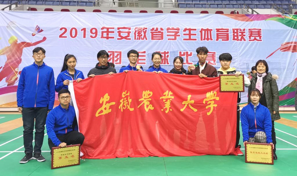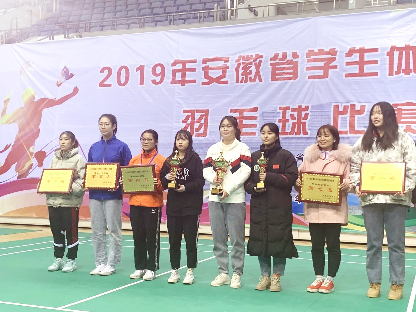 本网讯 2019年安徽省大学生体育联赛羽毛球比赛于12月9日—14日在安徽大学磬苑校区体育馆举行,我校取得混双第一名、男单第三名、女单第五名、女双第五名、男团第五名、女团第五名的好成绩,并获得体育道德风尚奖。
