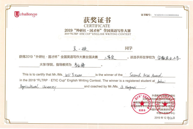 今年共有90名选手参加英语写作大赛全国决赛,选手来自全国各省市自治区及澳门特别行政区高校。在今年10月举办的安徽赛区比赛中我校吴一璇同学以优异成绩荣获安徽赛区一等奖并晋级全国决赛,此次在全国决赛中获奖,再次展示了我校学子的优秀风采,展现了我校外语教学的层次和水平。