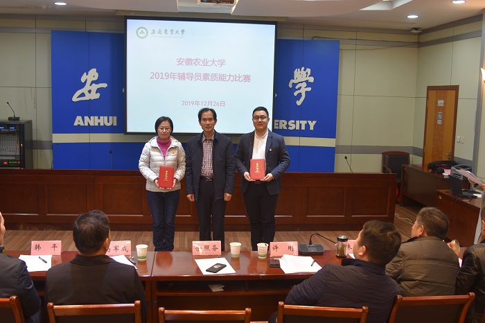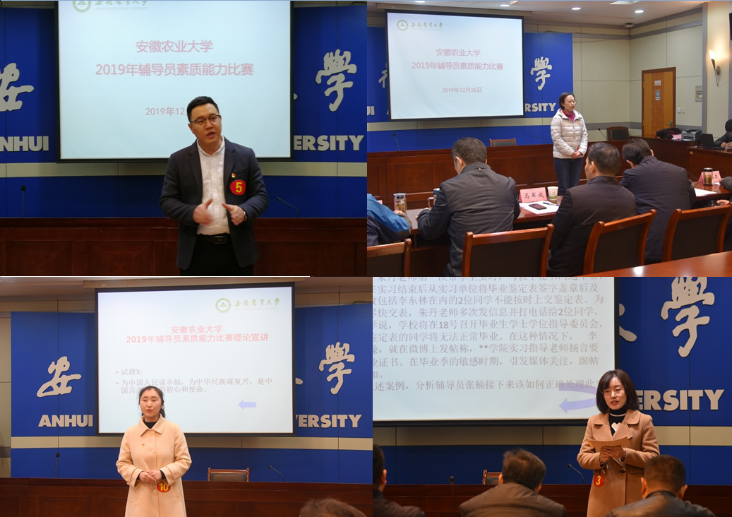 本网讯为深入学习宣传贯彻习近平新时代中国特色社会主义思想和党的十九大精神,全面贯彻落实全国全省高校思想政治工作会议精神和《普通高等学校辅导员队伍建设规定》要求,12月26日上午,我校2019年辅导员素质能力比赛决赛在第二会议室举行。校党委副书记裴树东到现场指导并观看了比赛。比赛特邀安徽大学、安徽医科大学、合肥学院党委学工部(处)负责人担任评委嘉宾,邀请校党委常委韩平、宣传部常务副部长朱绍友、机关第一党总支书记刘惠东、招生就业处处长刘海涛担任评委。各院分管学生工作负责人和专兼职辅导员观摩了比赛。