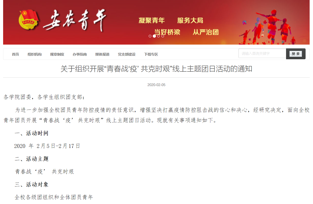 疫情爆发初期,我校共青团即刻微信推文《“年”因有你,更加温暖》,致敬以钟南山院士为代表的逆行者与坚守者。随后,陆续编发以《新冠肺炎防控贴士,我们至少可以做到这九点》为代表的多篇推文,宣传普及防护知识,倡导广大安农青年科学防疫。并通过微信、QQ群、微信群、微博、网站等线上途径,积极宣传《教育部致全国大学生的一封信》《共青团中央关于坚持党的领导,全团动员,在防控疫情阻击战中充分发挥共青团生力军和突击队作用的通知》《关于加强我校新型冠状病毒感染的肺炎疫情防范工作的通知》等,将上级和学校党委关于疫情防控工作的有关精神及时传递给每一位安农青年学子。同时,编发《@全体安农青年:行动起来!我们承诺,我们践行!》《@全体安农青年,疫情防控,和农娃一起这样做!》《致全校同学的倡议书》等,进一步坚定了广大安农青年抗击疫情的信心、掀起了行动起来的热潮。此外,各学院青年学子还纷纷通过自拍视频、制作海报等多种形式传递温情正能量,为武汉加油、为中国鼓劲。