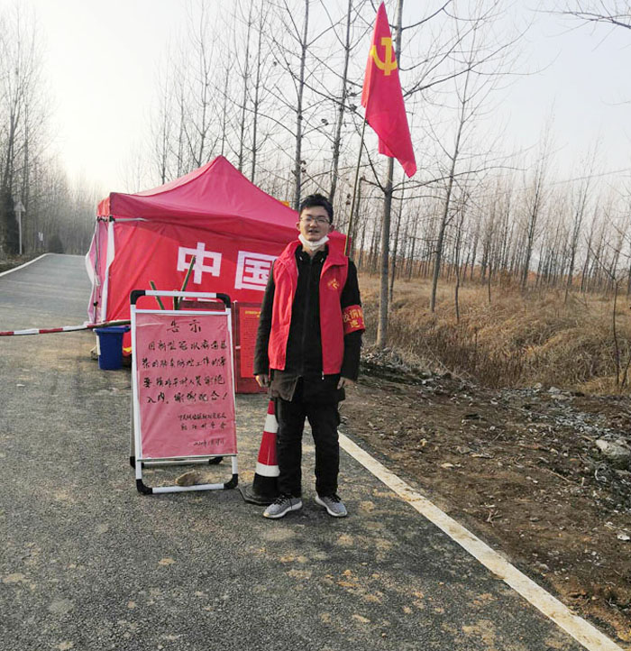 郭钊阳是我校林学与园林学院2018级城乡规划专业学生,作为家乡疫情防控工作的志愿者,他每天的主要工作是排查外来人员情况、进村开展宣传以及看护关卡点等。从辖区的最西边到最东边,从每天的清晨到临近黑夜,面对极少数人的不理解甚至强硬的态度,也只能一遍遍的反复解释……他坦言,每天外出免不了要和很多人有接触,担心总是有的,但是疫情当前,工作总需要有人去做。每一天的亲身经历,都让他真切体会到了这是一场没有硝烟的“人民战争”,他相信,只要大家齐心协力、万众一心,光明终将穿破阴霾,取得疫情防控工作的胜利。