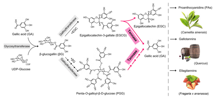 单宁化合物高含量积累在茶树、柿子、葡萄、草莓等作物中,与它们的风味品质和健康功效密切相关。长期以来,有关调控植物单宁化合物的合成及水解途径的关键基因尚不清楚,成为国内外植物界高度关注的研究热点。夏涛课题组经过十余年的潜心研究,从茶树中分离纯化鉴定了茶树单宁酶;进一步分析表明该酶属于单宁酰基水解酶家族,并发现该家族酶普遍存在于柿子、葡萄、草莓等富含单宁的植物中;通过基因功能验证证实它们参与调控了酯型儿茶素、没食子单宁和鞣花单宁的代谢;进化证据表明,编码这些蛋白质的单宁酶基因家族不同于微生物单宁酶基因,在植物中具有独立的系统进化起源。