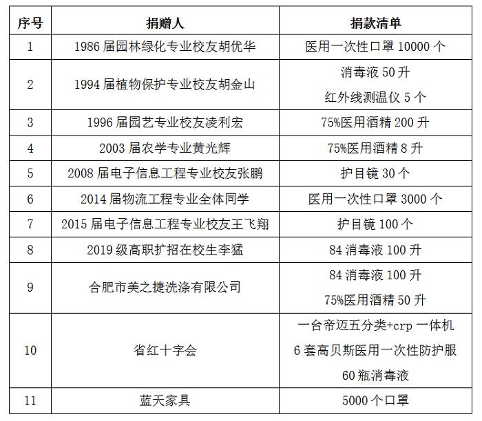 信息发布以来,学校陆续收到了许多校友和社会爱心人士的慷慨捐赠:1994届植物保护专业校友胡金山捐赠消毒液50升、红外线测温仪5个,1996届园艺专业校友凌利宏捐赠75%医用酒精200升……还有很多校友积极帮忙联系防控物资采购渠道,校友的爱心从全国各地纷纷向母校汇聚。