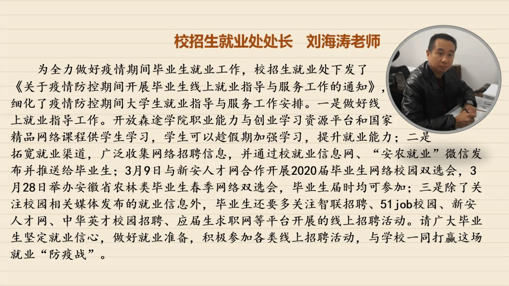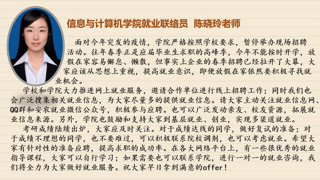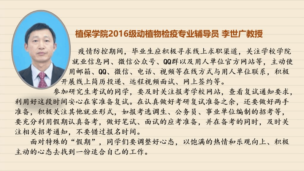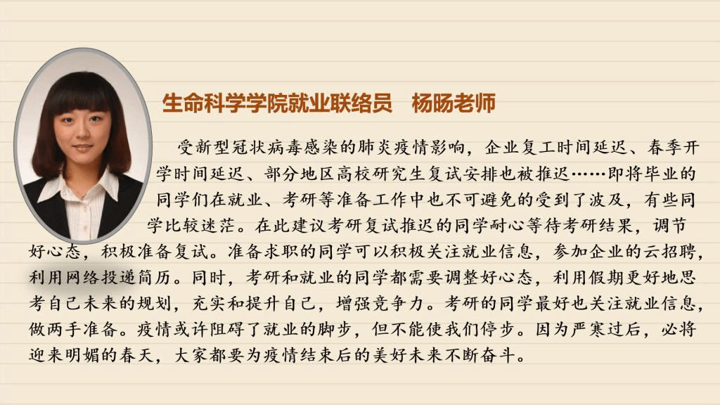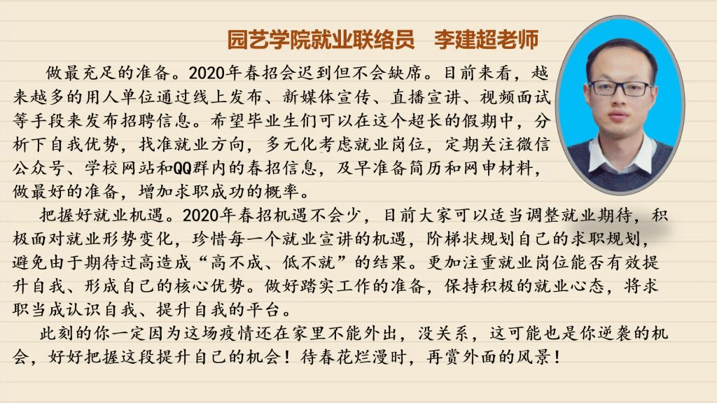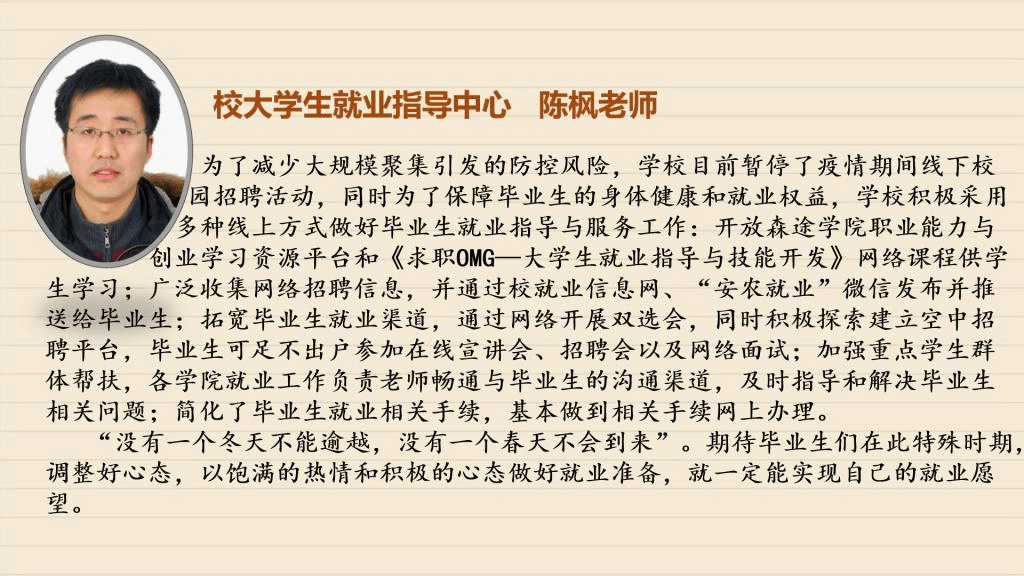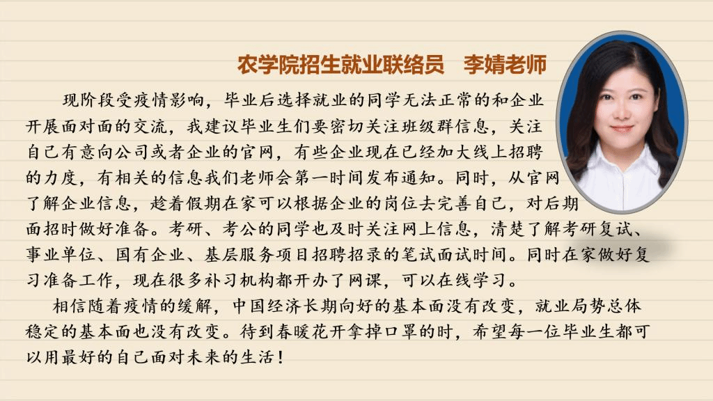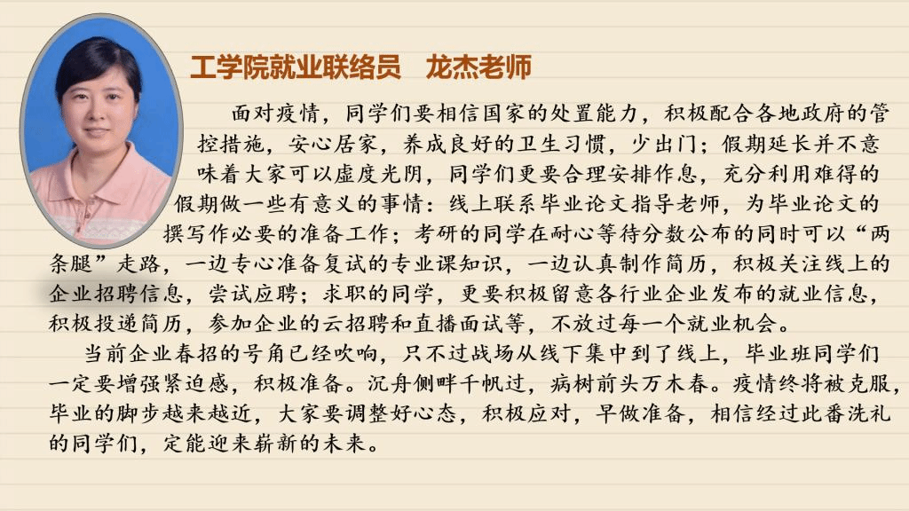 受到疫情的影响,毕业班同学们需要面对的毕业论文设计、考研复试、毕业实习、求职面试等各项工作都无法顺利进行,毕业在即,面对这样的形势,同学们该如何应对?【战“疫”师者说】第三期,我们采访了学校招生就业处以及各学院负责就业工作的老师、毕业班辅导员,看看他们如何支招。