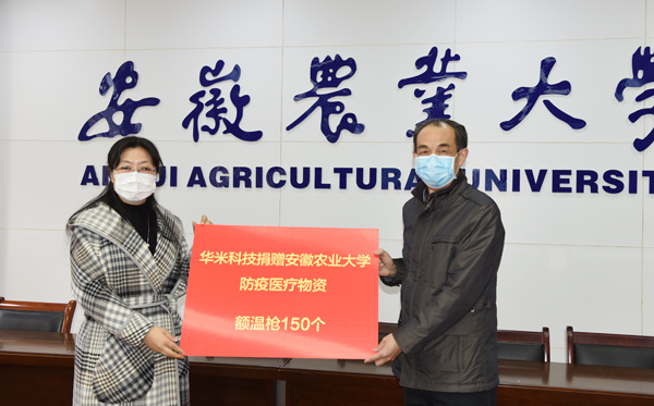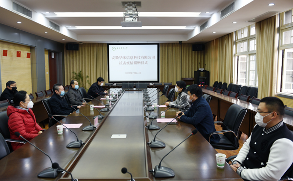 本网讯 2月24日,安徽华米信息科技有限公司向我校捐赠150个额温枪,捐赠仪式在第三会议室举行。校党委书记江春,校长夏涛,党委常委、副校长李红,党委常委、副校长韩军,安徽华米信息科技有限公司副总裁吴海啸、资深行政总监顾志强等出席仪式。