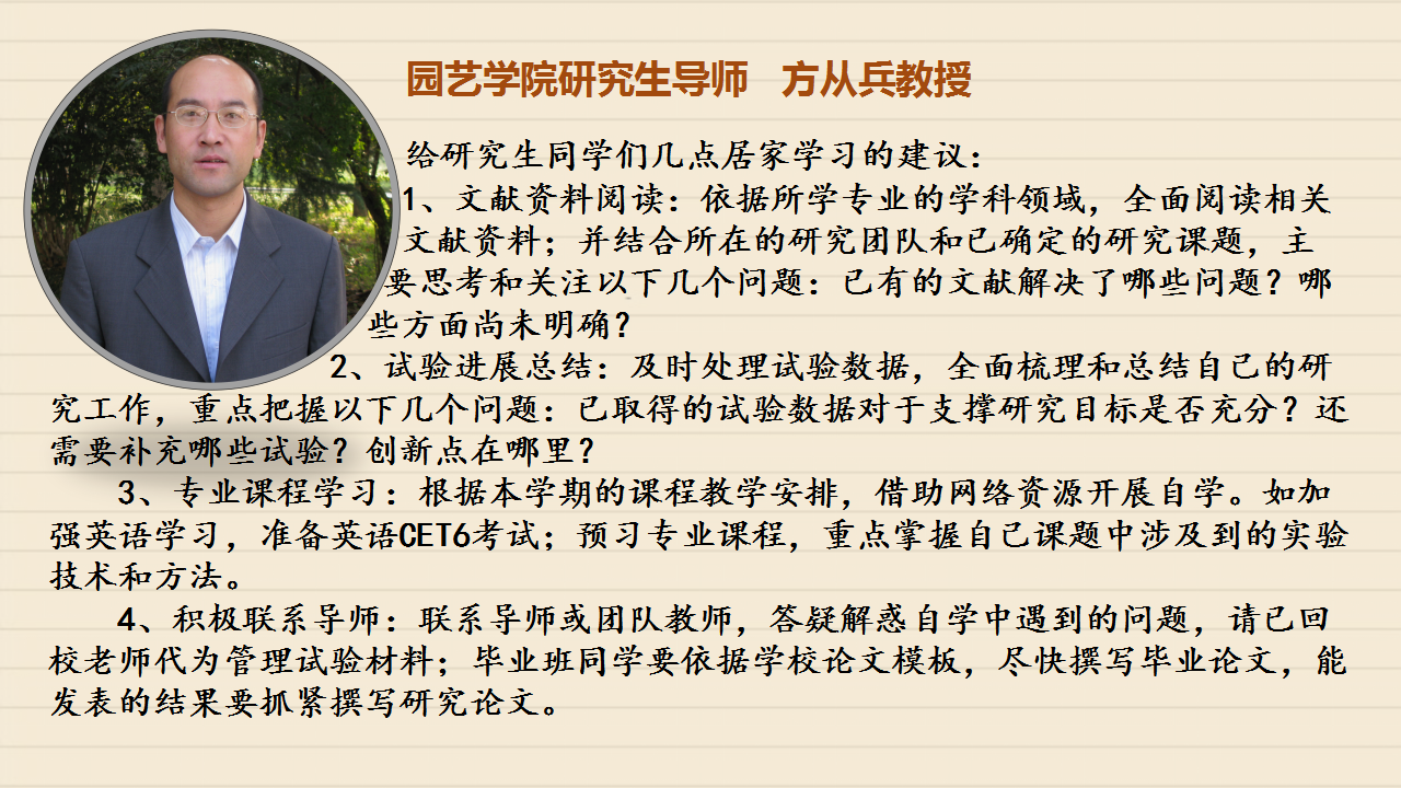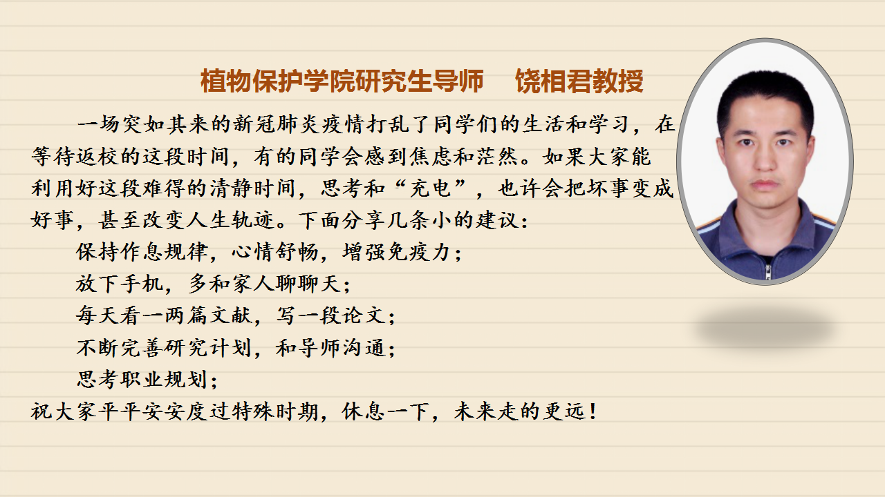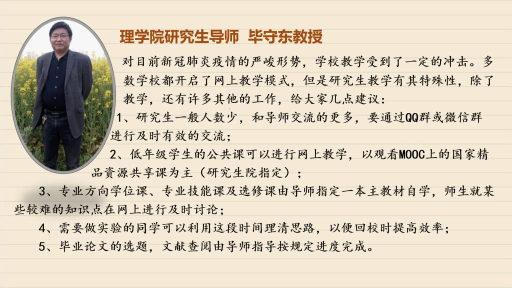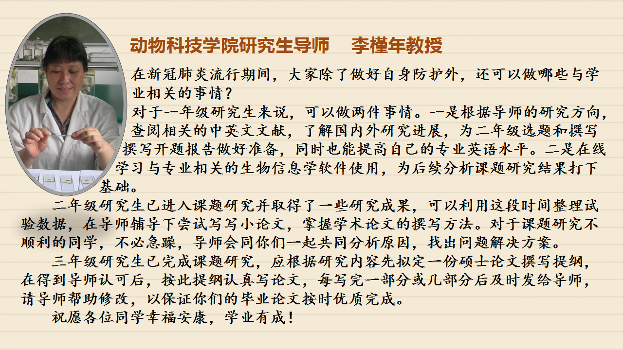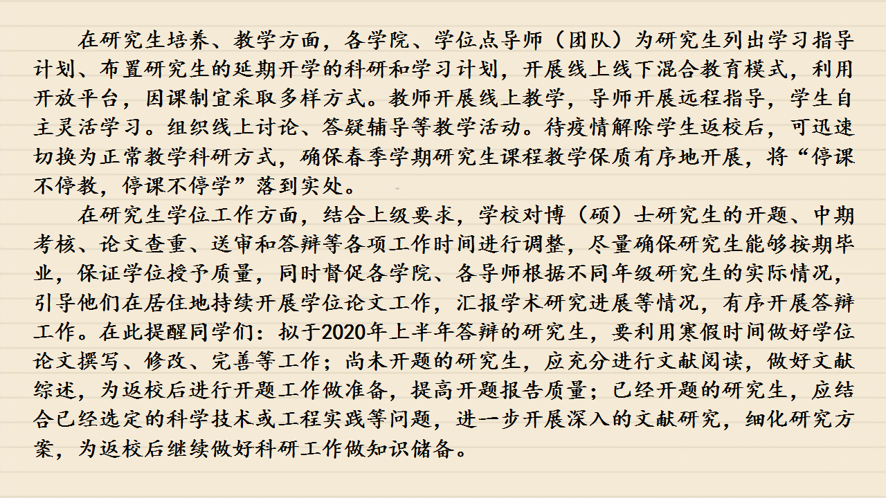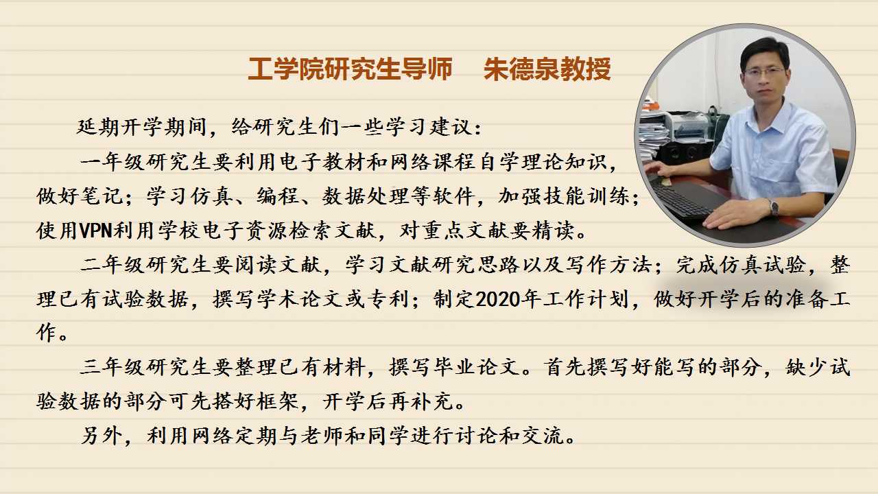 新冠肺炎疫情期间,学校按照上级要求,及时启动了线上教学,对于广大研究生同学来说,在线学习的同时,还很关注各项正在进行中的科研工作。学校目前研究生工作是怎样安排的?研究生同学们居家如何自主开展学习和科研?听听导师们有哪些叮咛。