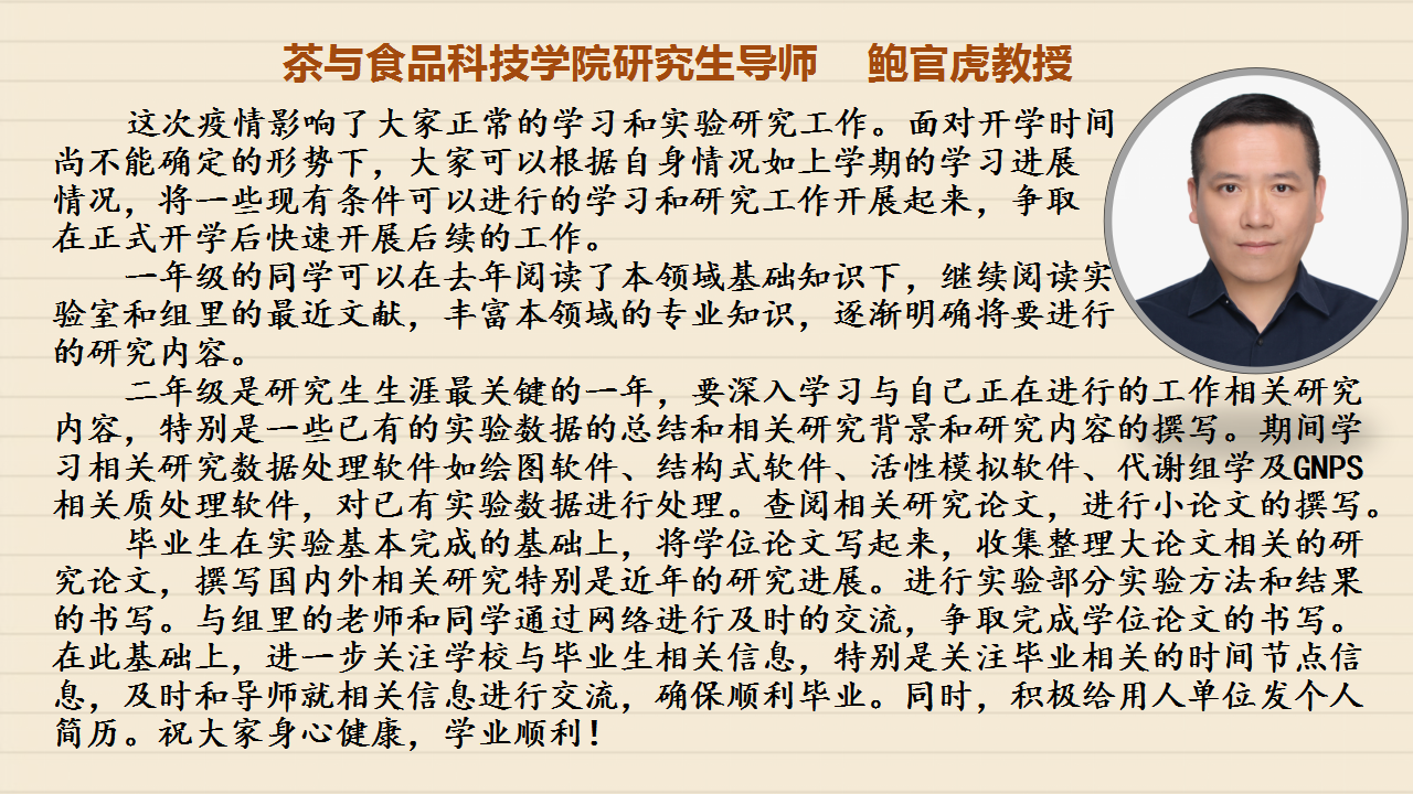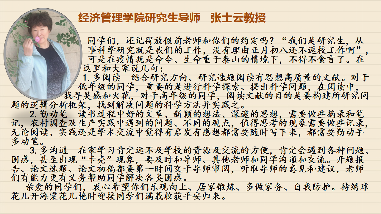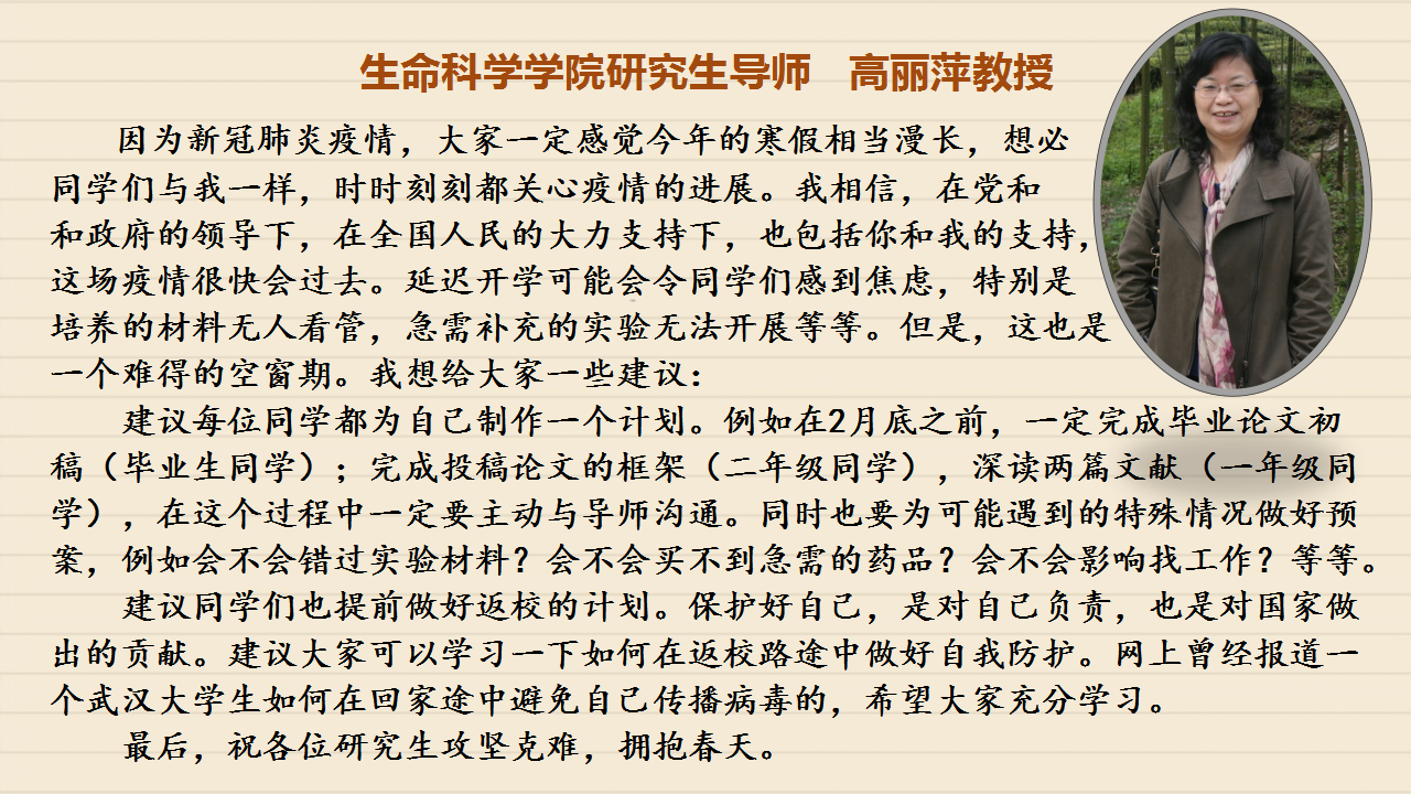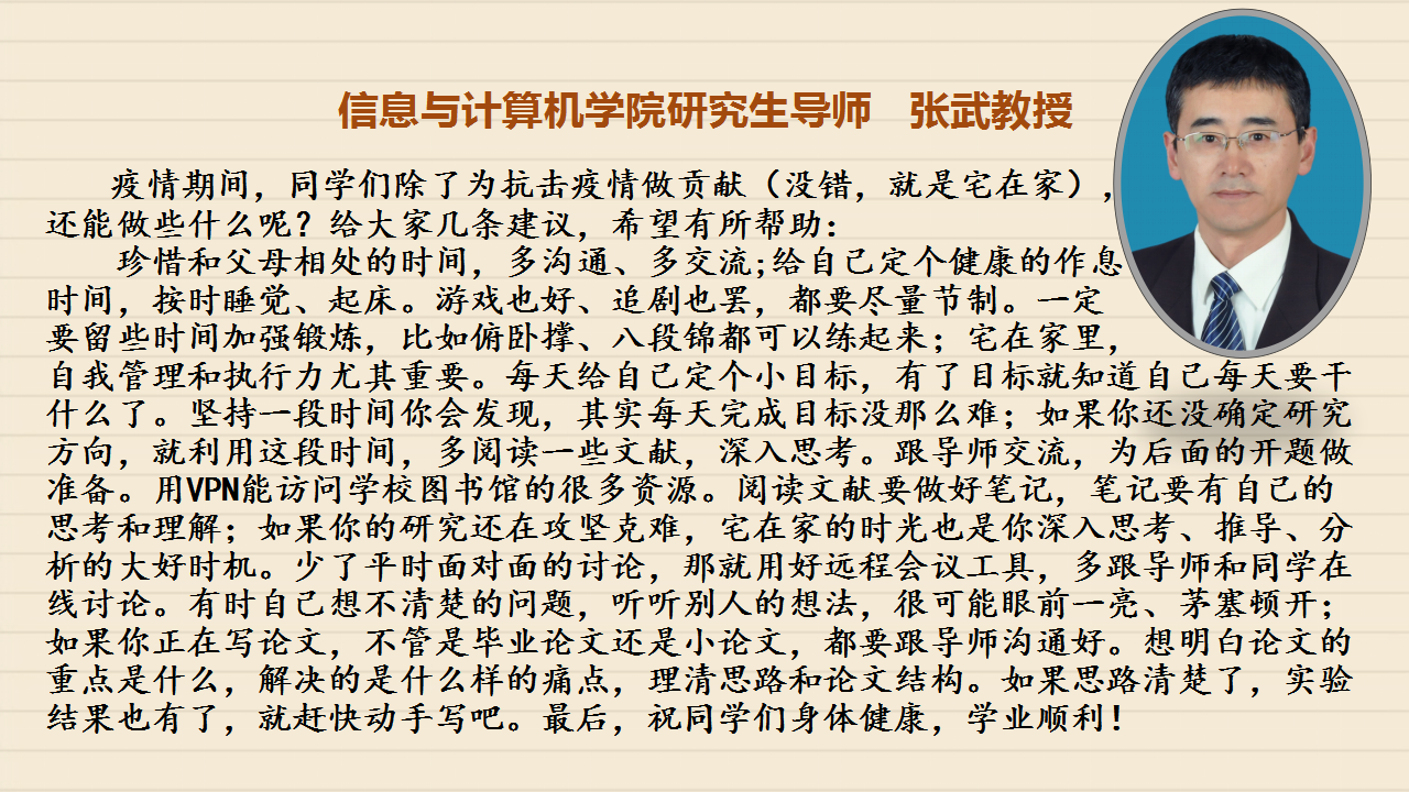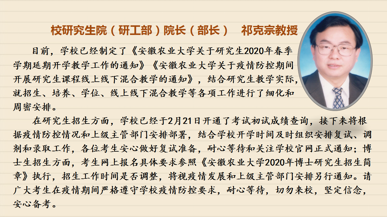 新冠肺炎疫情期间,学校按照上级要求,及时启动了线上教学,对于广大研究生同学来说,在线学习的同时,还很关注各项正在进行中的科研工作。学校目前研究生工作是怎样安排的?研究生同学们居家如何自主开展学习和科研?听听导师们有哪些叮咛。