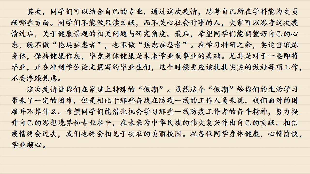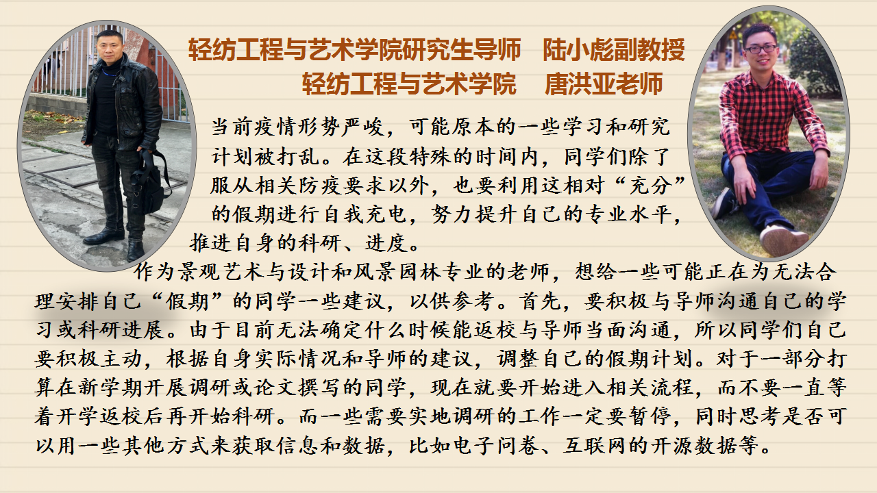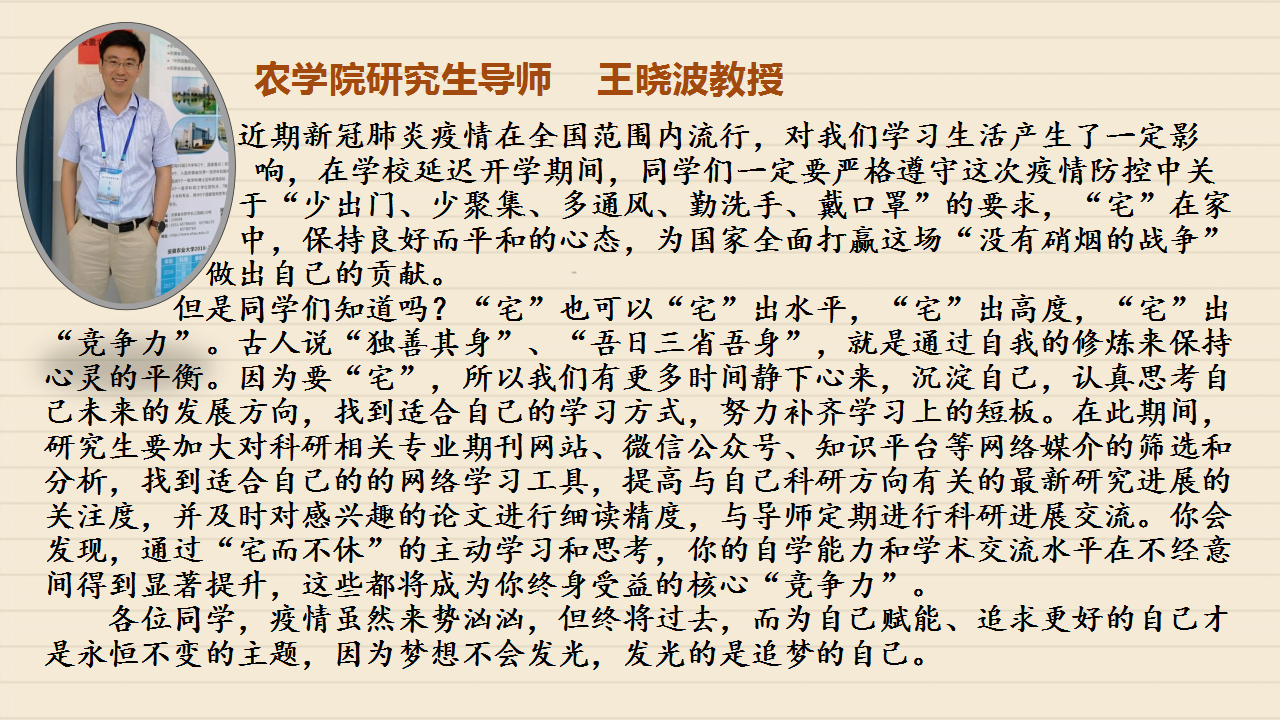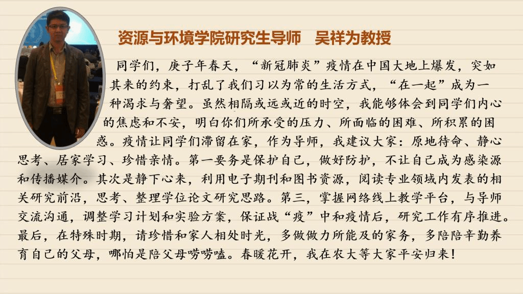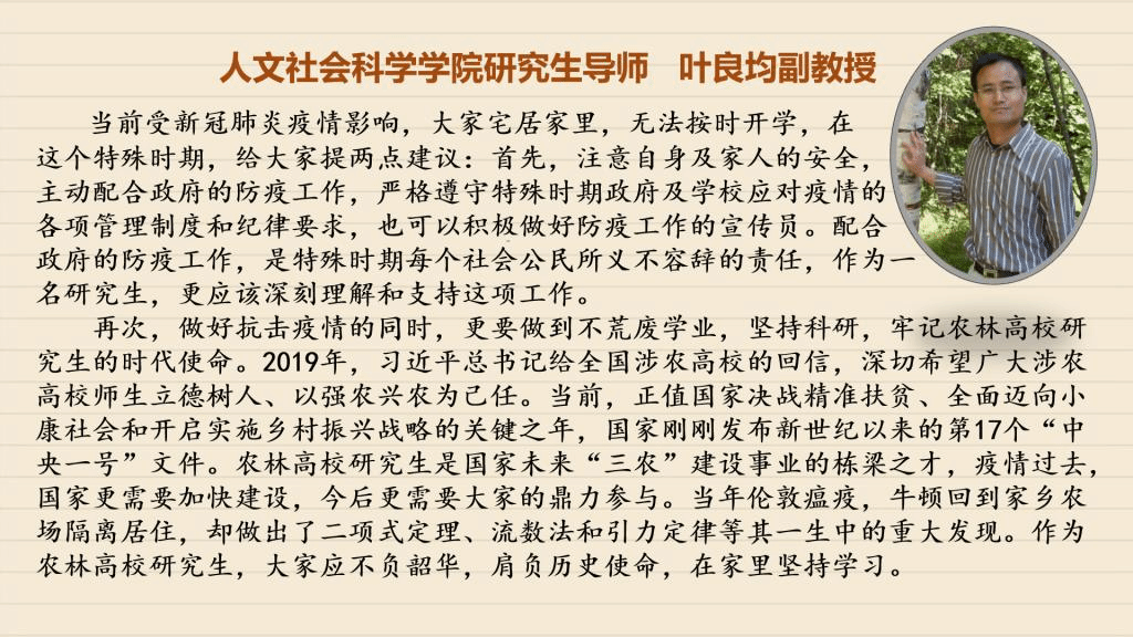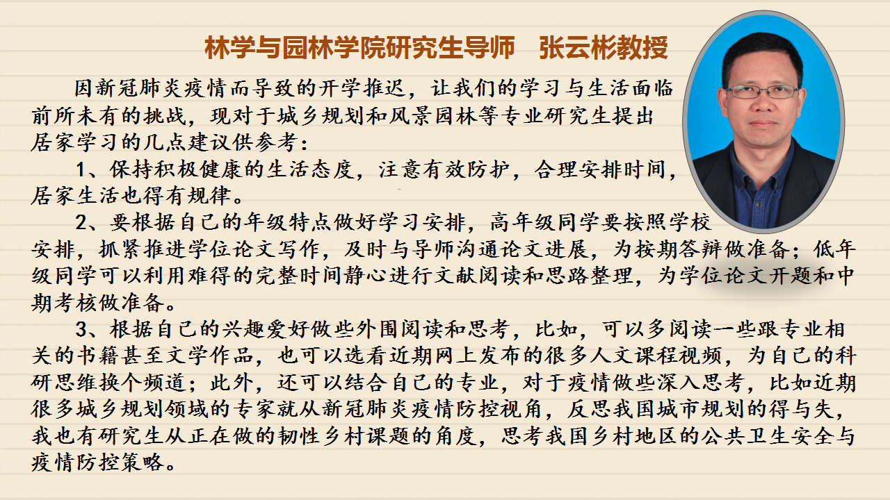 新冠肺炎疫情期间,学校按照上级要求,及时启动了线上教学,对于广大研究生同学来说,在线学习的同时,还很关注各项正在进行中的科研工作。学校目前研究生工作是怎样安排的?研究生同学们居家如何自主开展学习和科研?听听导师们有哪些叮咛。
