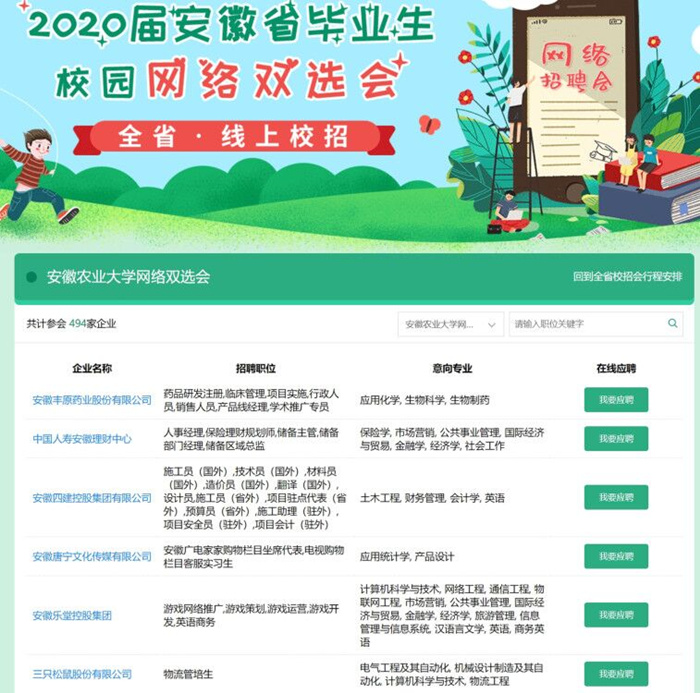 本网讯为切实做好疫情防控期间毕业生就业工作,最大限度减少疫情对毕业生就业工作的影响,为毕业生和用人单位搭建更便捷的交流平台,3月9日,我校与新安人才网联合举办了“安徽农业大学2020届毕业生春季网络双选会”。
