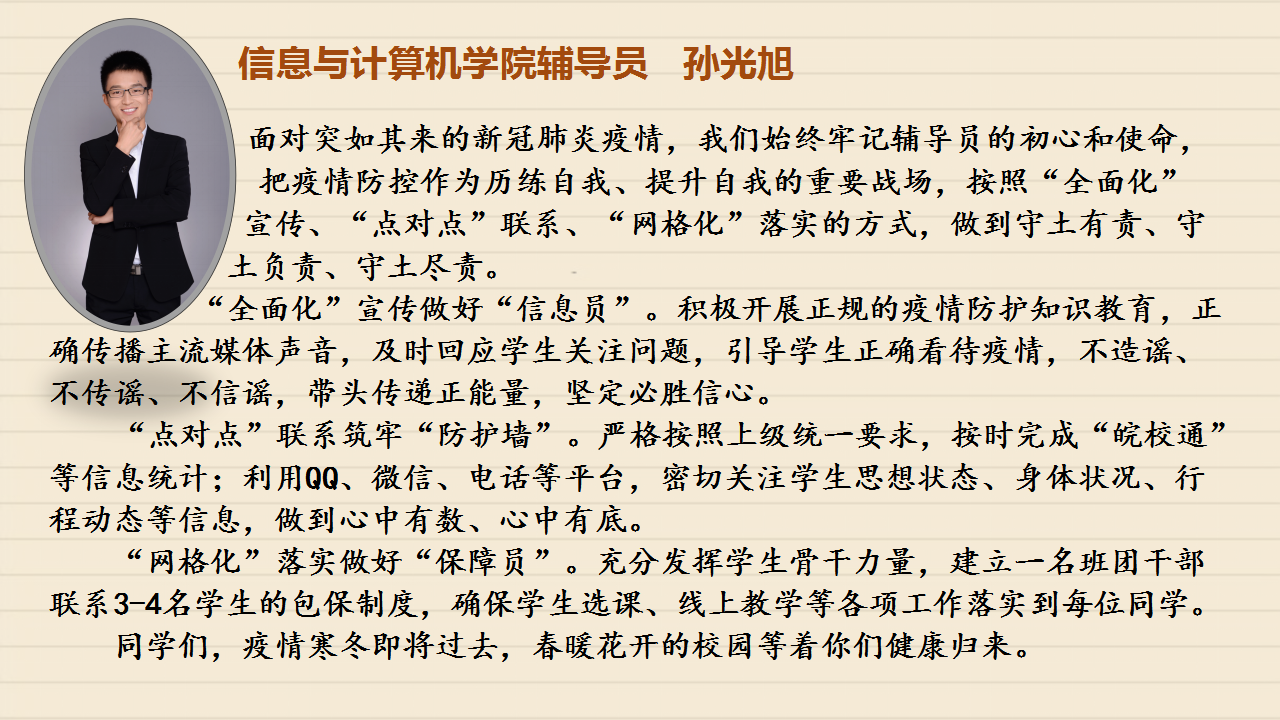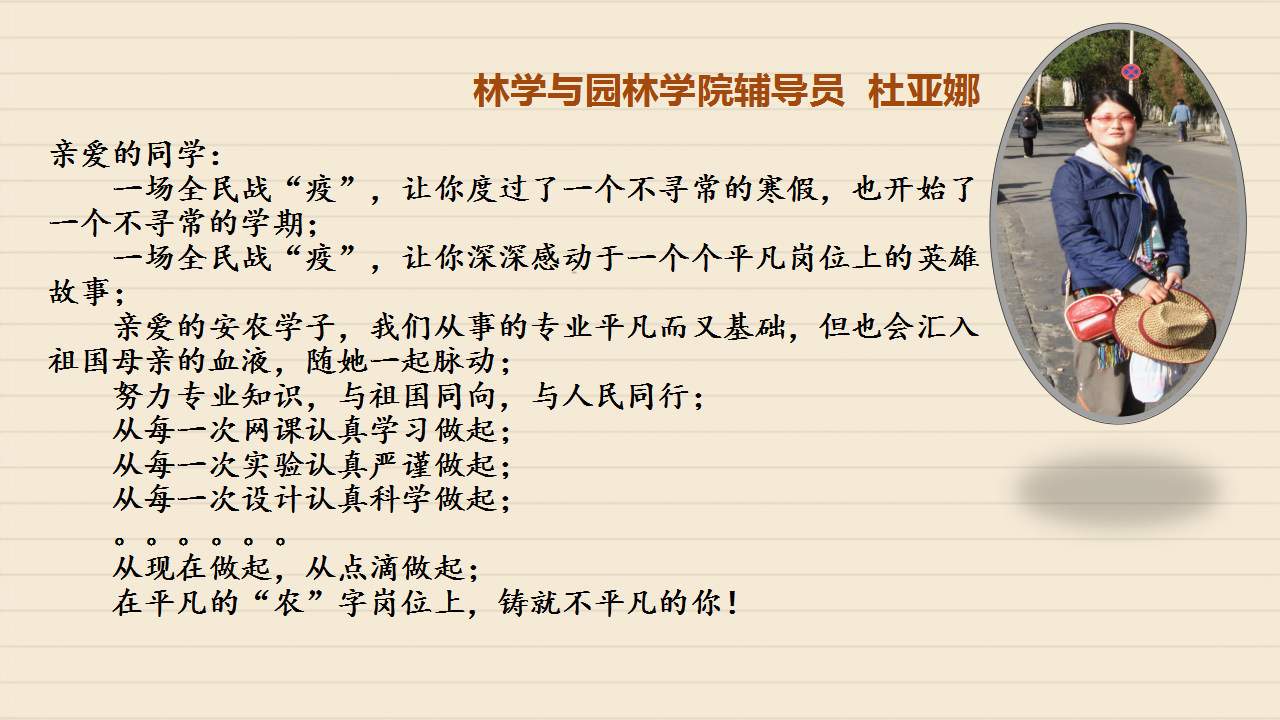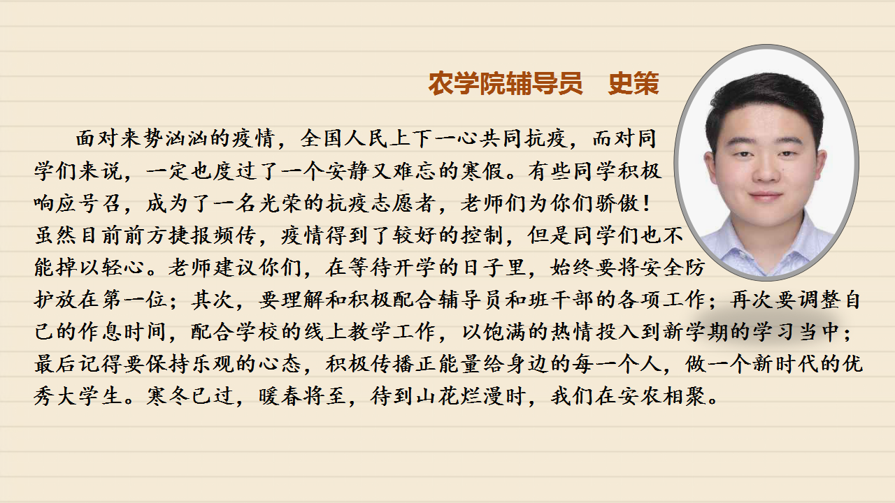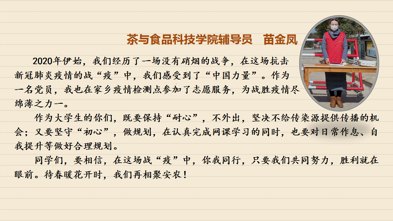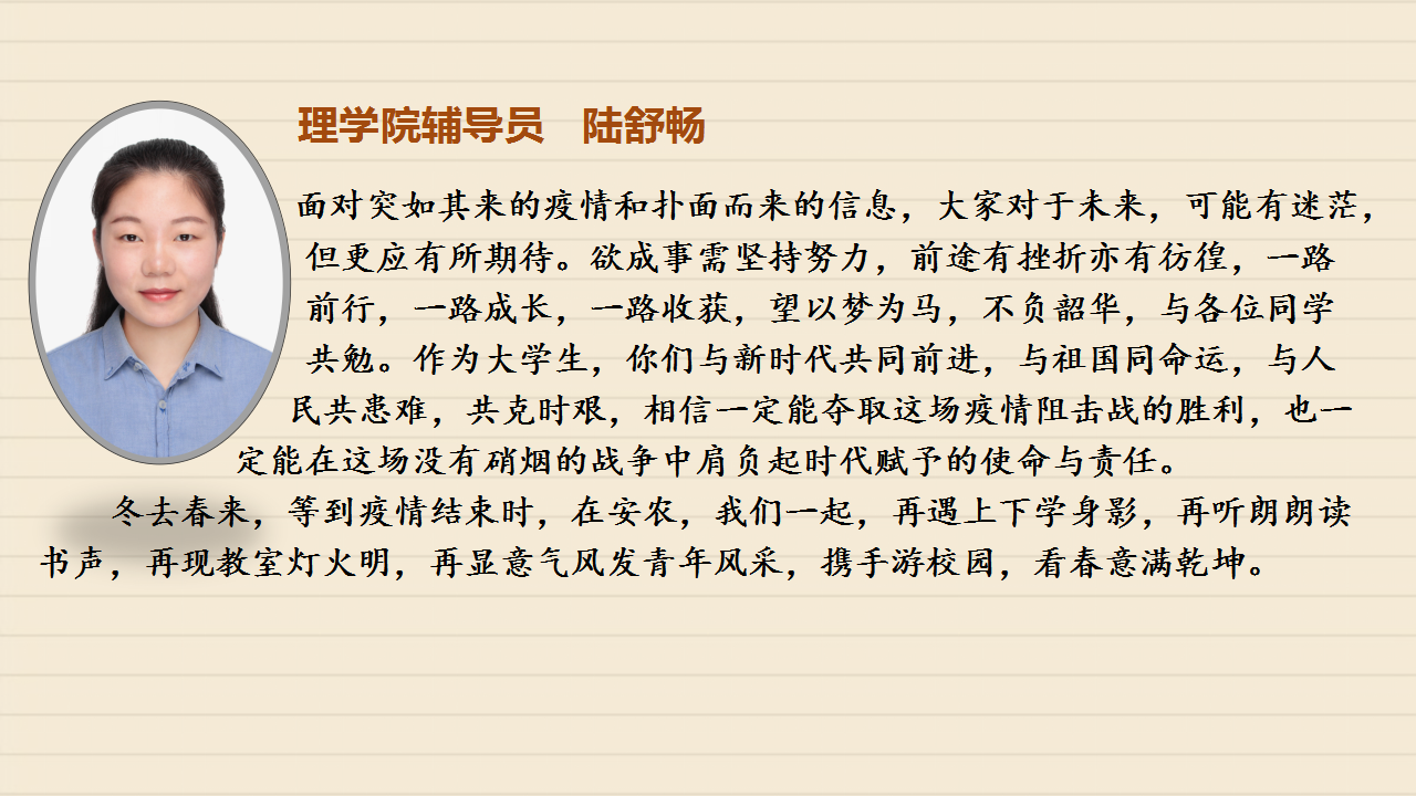 自新冠肺炎疫情发生以来,安农全体辅导员老师们始终默默奋斗在战“疫”一线,关注疫情数据、摸排学生情况、做好防疫宣传…………他们用实际行动守护着安农两万多名学子,用奉献和坚持践行着辅导员的岗位职责,诠释了辅导员的初心和使命。近日,教育部思政司党支部向全国高校辅导员致信,作为全国高校辅导员的“娘家人”,为大家点赞,向大家致敬,并勉励大家“以更加顽强的意志,以更加坚强的党性,以更加有力的行动,当好教育系统疫情防控的‘大考之人’,早日夺取抗击疫情斗争的全面胜利!”本期【战“疫”师者说】,听听辅导员们有哪些心里话想对同学说。