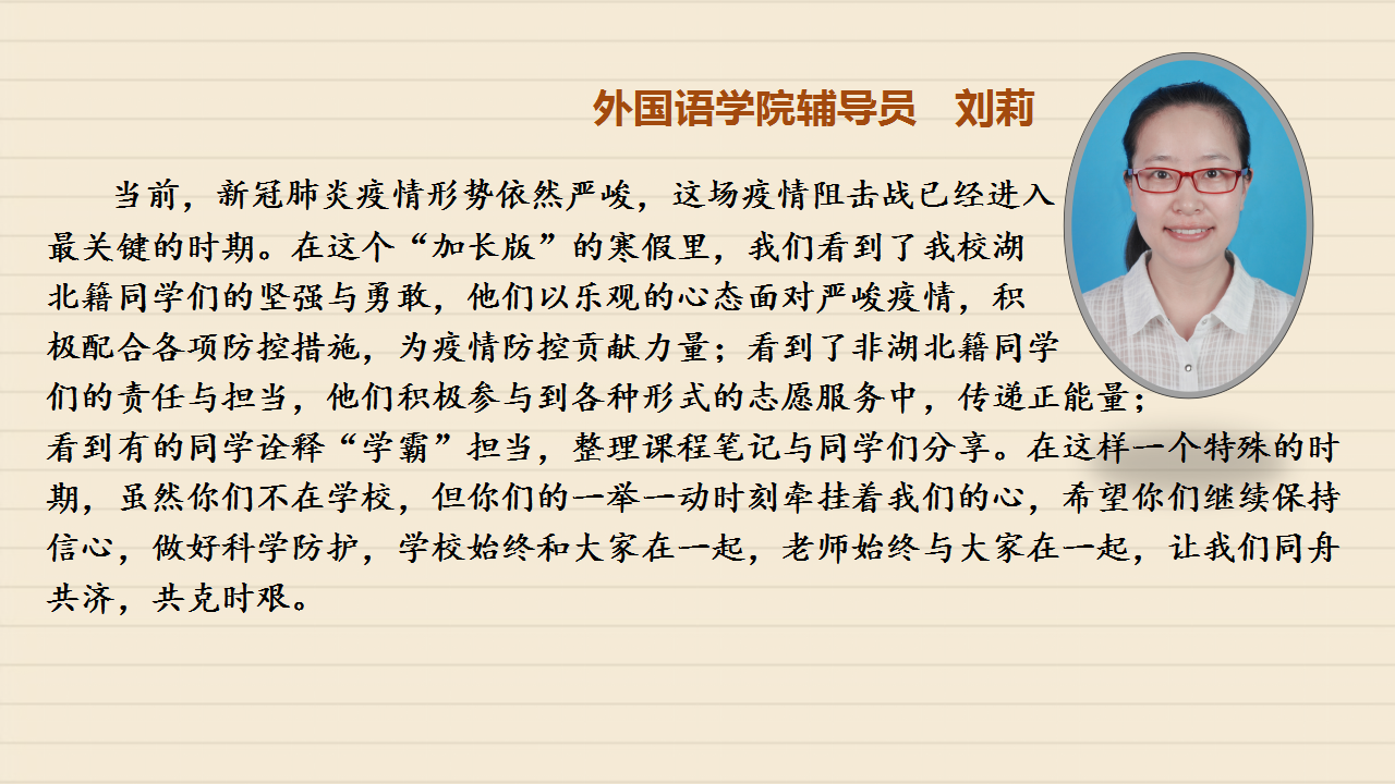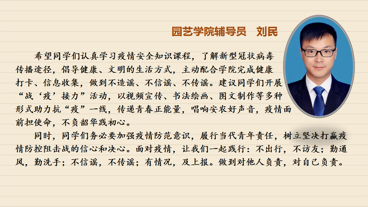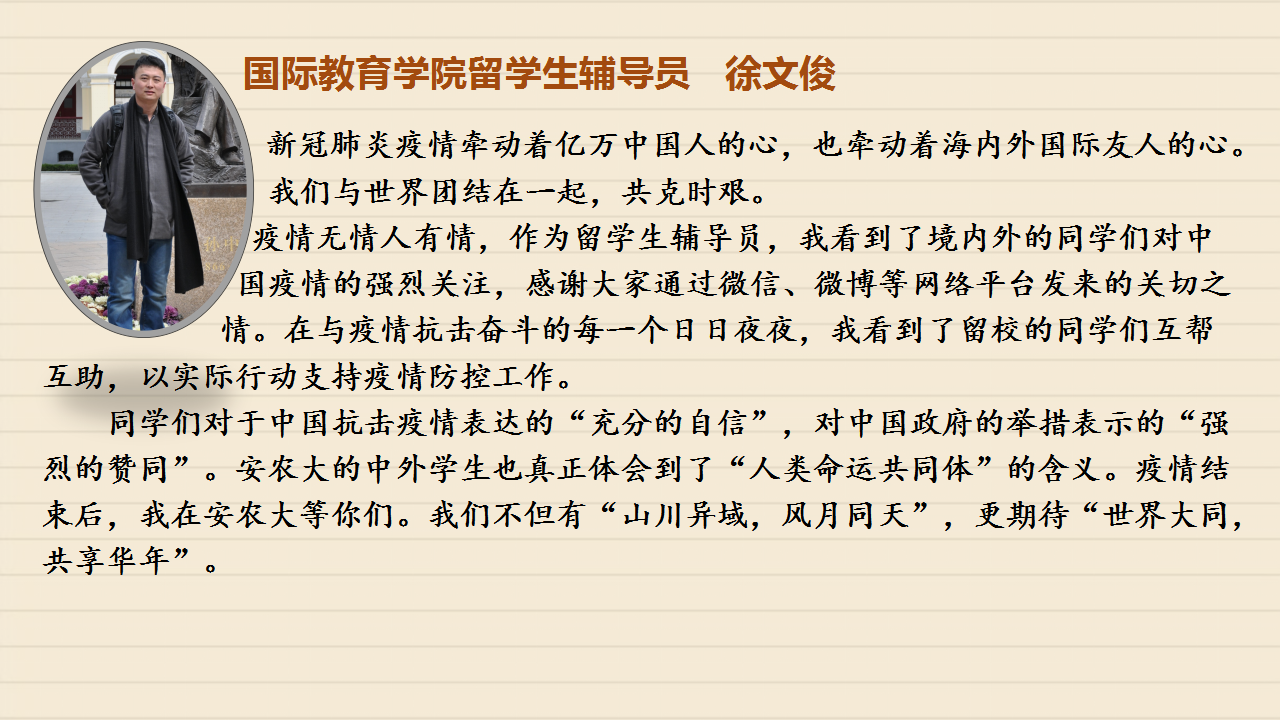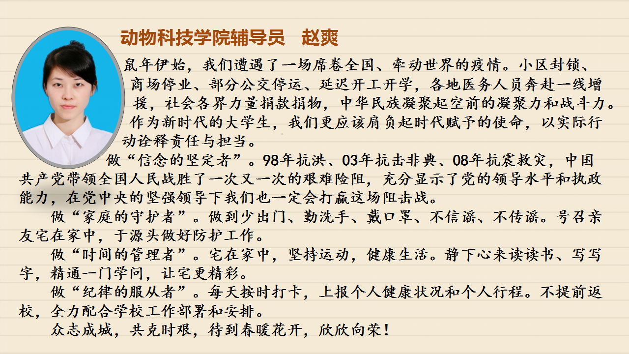自新冠肺炎疫情发生以来,安农全体辅导员老师们始终默默奋斗在战“疫”一线,关注疫情数据、摸排学生情况、做好防疫宣传…………他们用实际行动守护着安农两万多名学子,用奉献和坚持践行着辅导员的岗位职责,诠释了辅导员的初心和使命。近日,教育部思政司党支部向全国高校辅导员致信,作为全国高校辅导员的“娘家人”,为大家点赞,向大家致敬,并勉励大家“以更加顽强的意志,以更加坚强的党性,以更加有力的行动,当好教育系统疫情防控的‘大考之人’,早日夺取抗击疫情斗争的全面胜利!”本期【战“疫”师者说】,听听辅导员们有哪些心里话想对同学说。