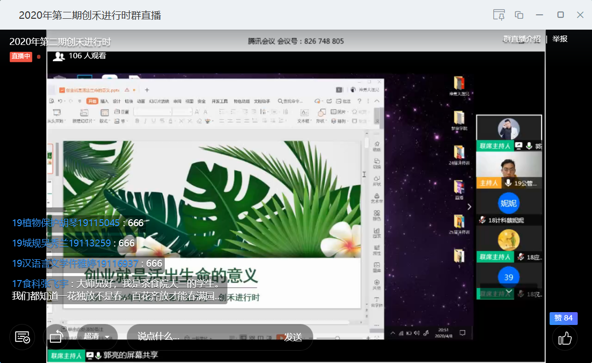 本网讯4月8日晚,我校校友、梦享学院创始人郭亮做客我校2020年第2期“创禾进行时”,通过线上直播的方式为广大创客带来了一场以“创业就是活出生命的意义”为主题的分享会。我校团学工作相关老师、2020年校“青马工程--菁穗领航计划”学习班全体成员以及广大创客共400余人参与了分享会。