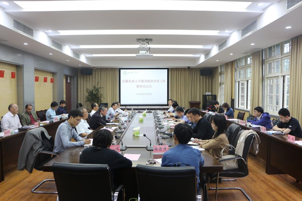 本网讯 5月8上午,《人民日报》、新华社、中央广播电视总台、《科技日报》、中国新闻社、《中国青年报》《农民日报》《中国教育报》《中国科学报》《安徽日报》、安徽新闻综合广播等11家中央、省骨干媒体记者齐聚我校,就“我校服务脱贫攻坚工作”进行集中采访。