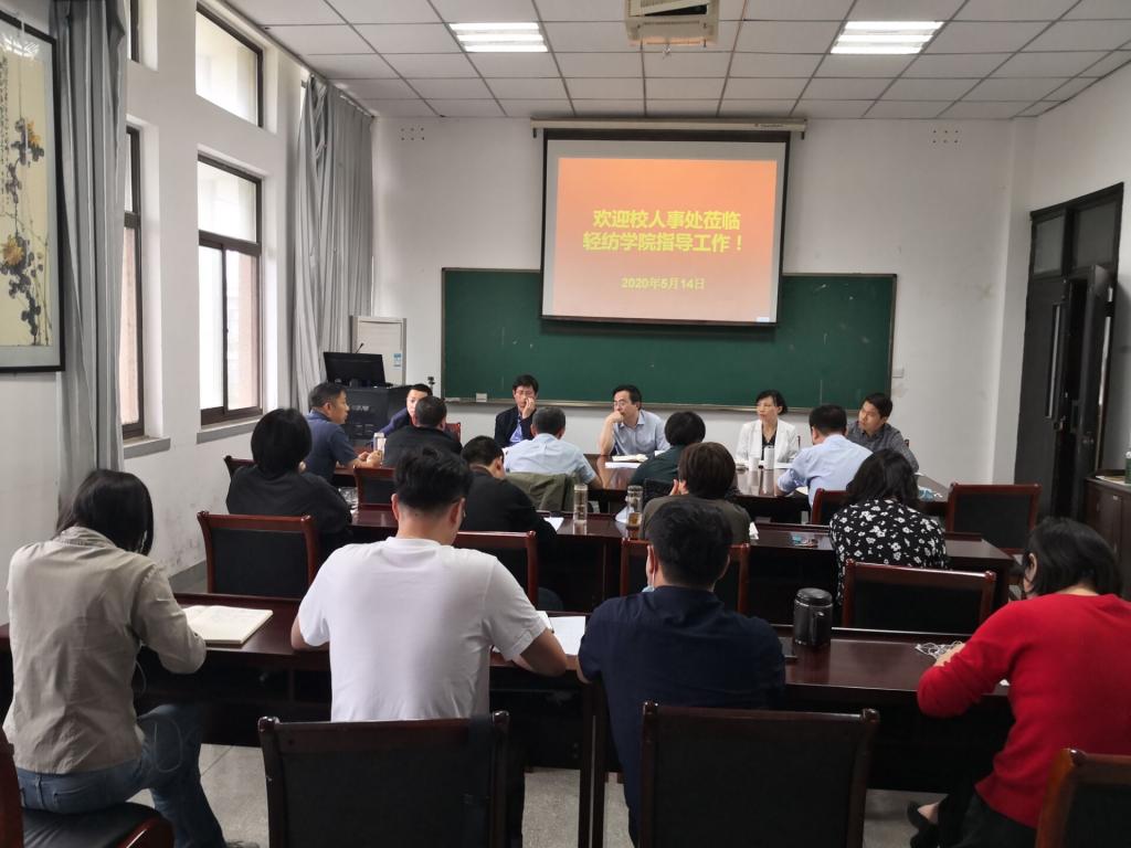 本网讯 5月14日上午,校党委常委、副校长朱立军带队深入轻纺工程与艺术学院开展“2020年人才建设年人才工作”主题调研。校人事处负责人及相关工作人员、轻纺工程与艺术学院党政班子成员、专业负责人、教师代表、专职辅导员和实验人员代表参加了本次会议。调研座谈会在轻纺工程与艺术学院会议室举行。
