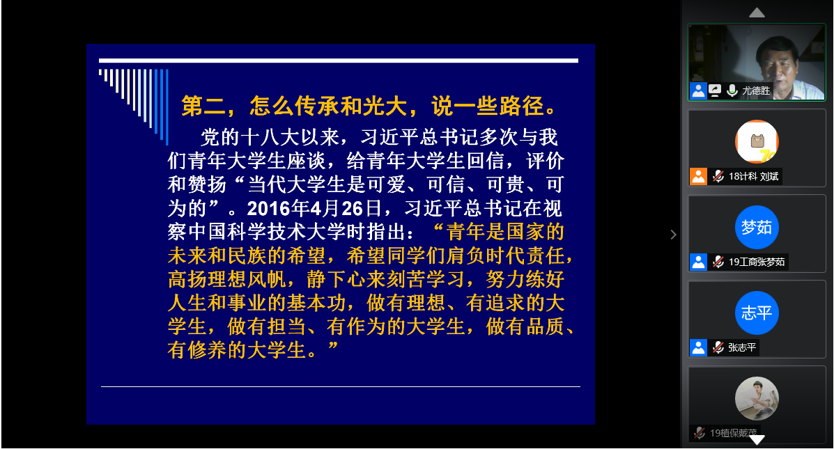 本网讯5月15日晚,校团委邀请信息与计算机学院原党委书记尤德胜为“青马工程-菁穗领航计划”学员,做主题为“学农安农、服务‘三农’、青春无悔”的在线直播理论培训,本期“青马工程”全体学员、指导老师参加了讲座。