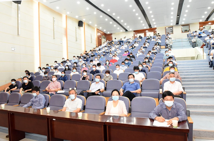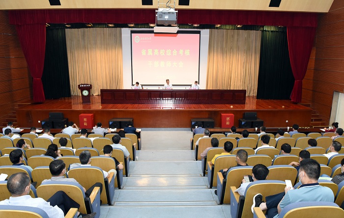 上午,学校在图书馆第一报告厅召开干部教师大会。校党委书记江春主持会议。省委第14考核组成员出席会议,校领导,校直各部门、各单位副处级以上干部,学院党政正职(含主持工作的副职),省级以上“两代表一委员”,民主党派市级以上主委,教代会执委,正高以上职称人员,学生代表等参加了会议。