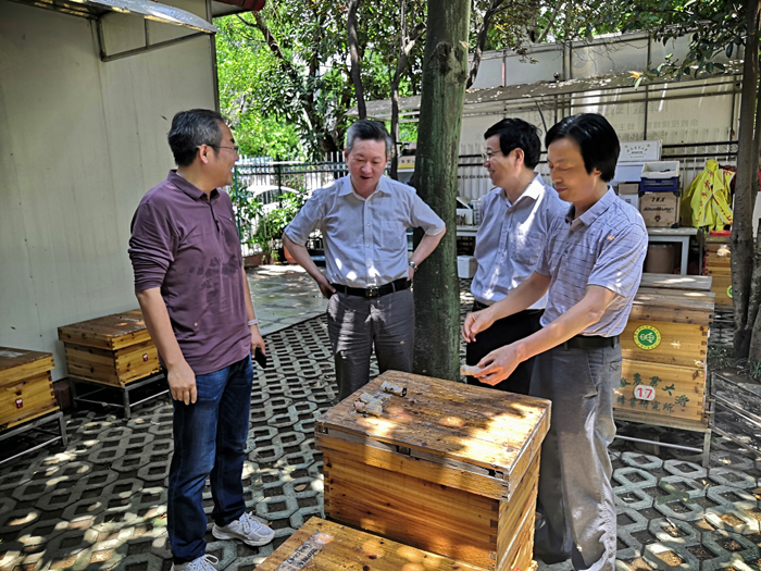 本网讯 6月1日中午,校领导江春、裴树东、蒋家平来到我校蜂业研究所调研指导,实地察看了我校教学试验种蜂场,听取了动物科技学院余林生教授关于我校蜂学学科建设发展情况汇报。