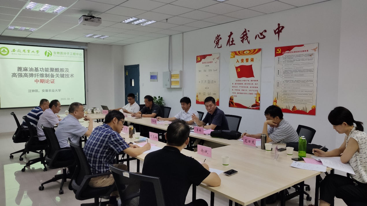 本网讯8月11日下午,安徽省重大科技成果工程化研发项目“蓖麻油基功能聚酰胺及高强高弹纤维制备关键技术开发”中期论证会在我校中西部楼圆满召开。会议邀请了安徽省科技厅成果转化与区域创新处处长李林、南京林业大学副校长勇强、中国林科院林化所科技处处长刘玉鹏、合肥工业大学化工学院徐卫兵、安徽大学化工学院周艺峰,以及我校林学与园林学院副院长徐斌对项目进展进行论证。校常务副校长马传喜、科技处处长花日茂、皖维集团副总工程师柳巨澜、课题负责人及骨干成员参会。